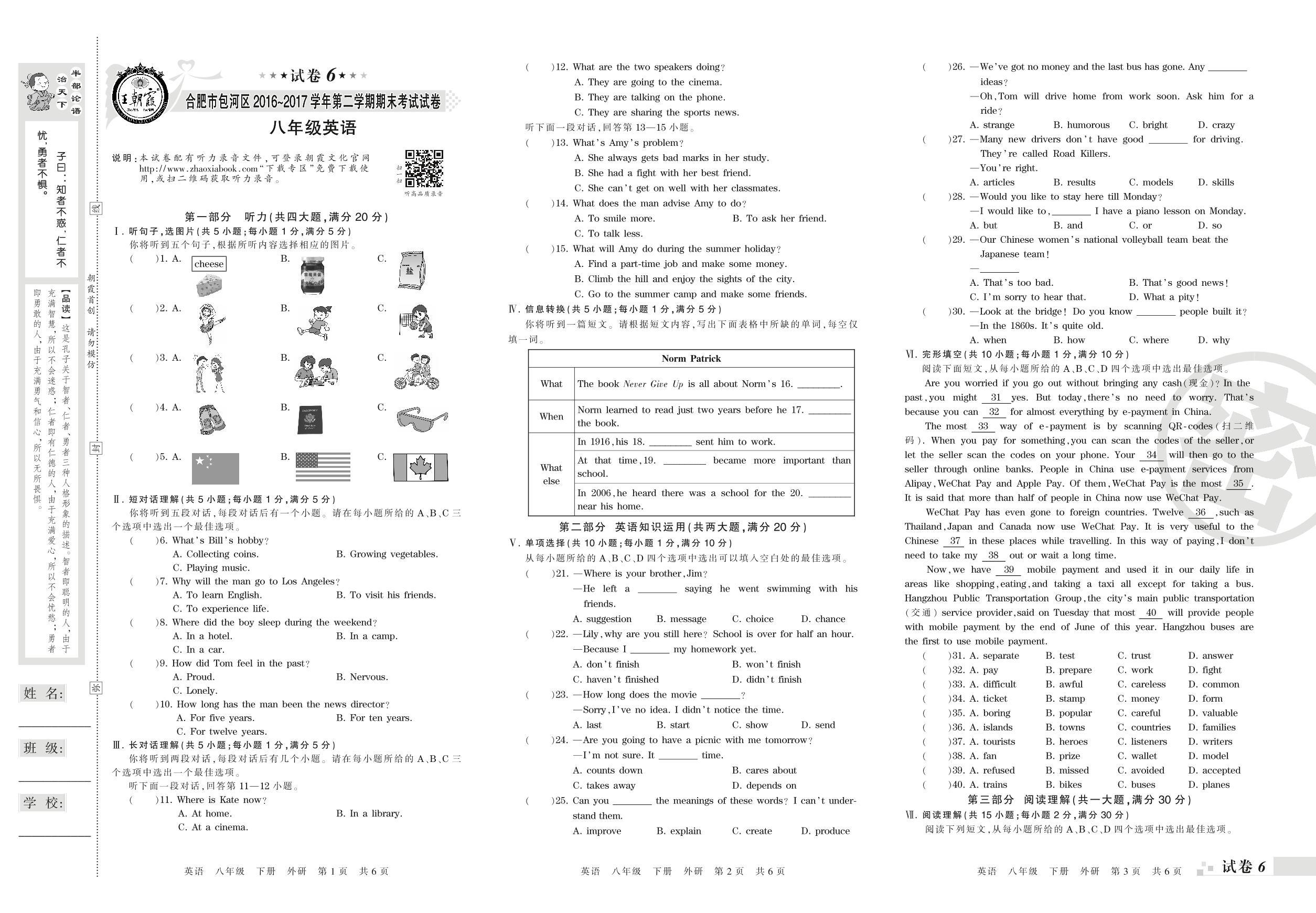 2016-2017学年第二学期合肥市包河区八年级英语试卷(外研版)【6】
