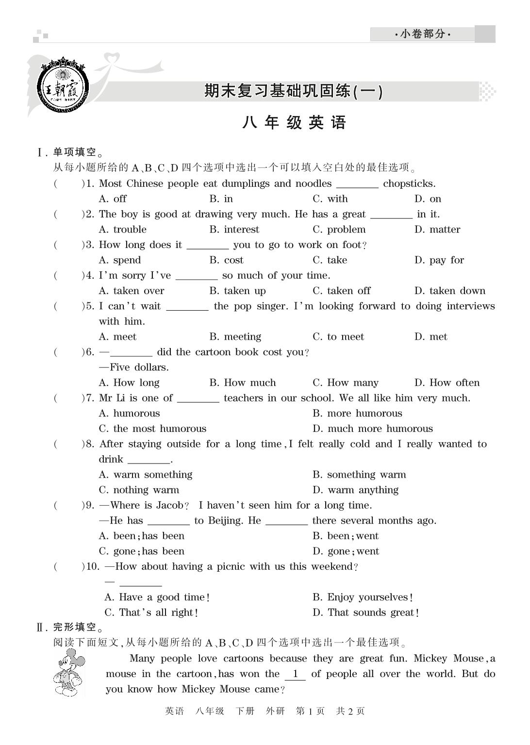 王朝霞期末小卷——期末复习基础巩固练(一)八年级下册英语(外研版)【0】
