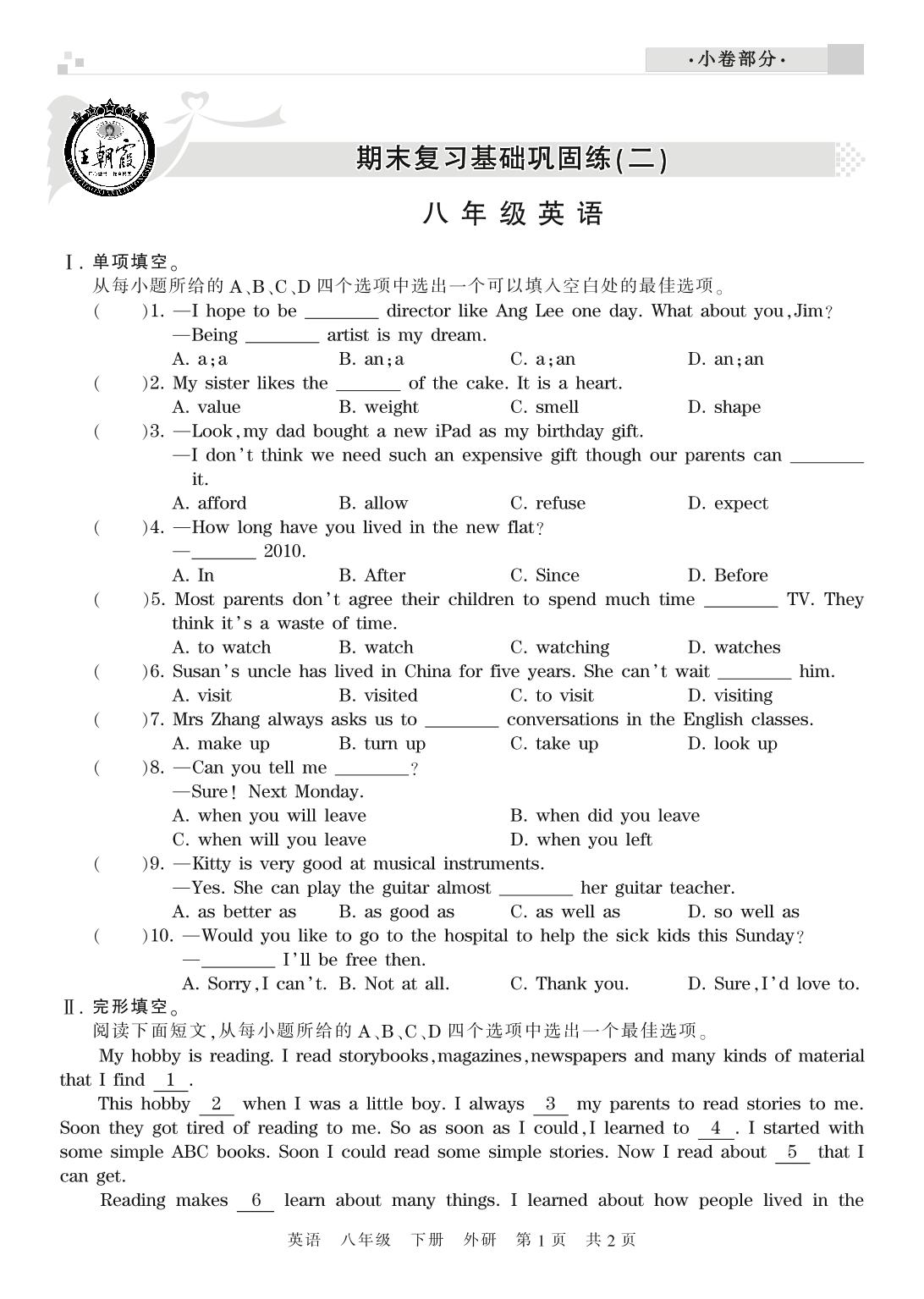 王朝霞期末小卷——期末复习基础巩固练(二)八年级下册英语(外研版)【0】
