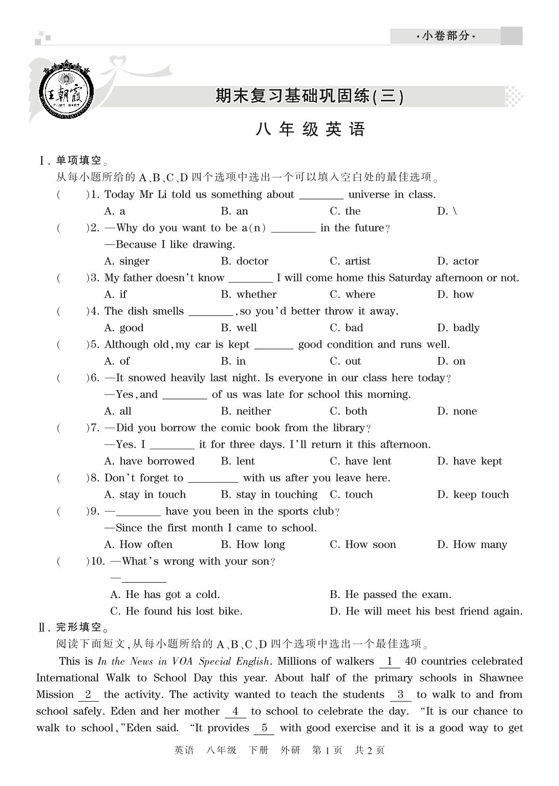 王朝霞期末小卷——期末复习基础巩固练(三)八年级下册英语(外研版)【0】