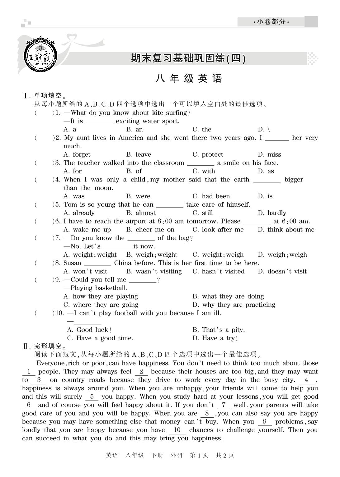 王朝霞期末小卷——期末复习基础巩固练(四)八年级下册英语(外研版)【0】