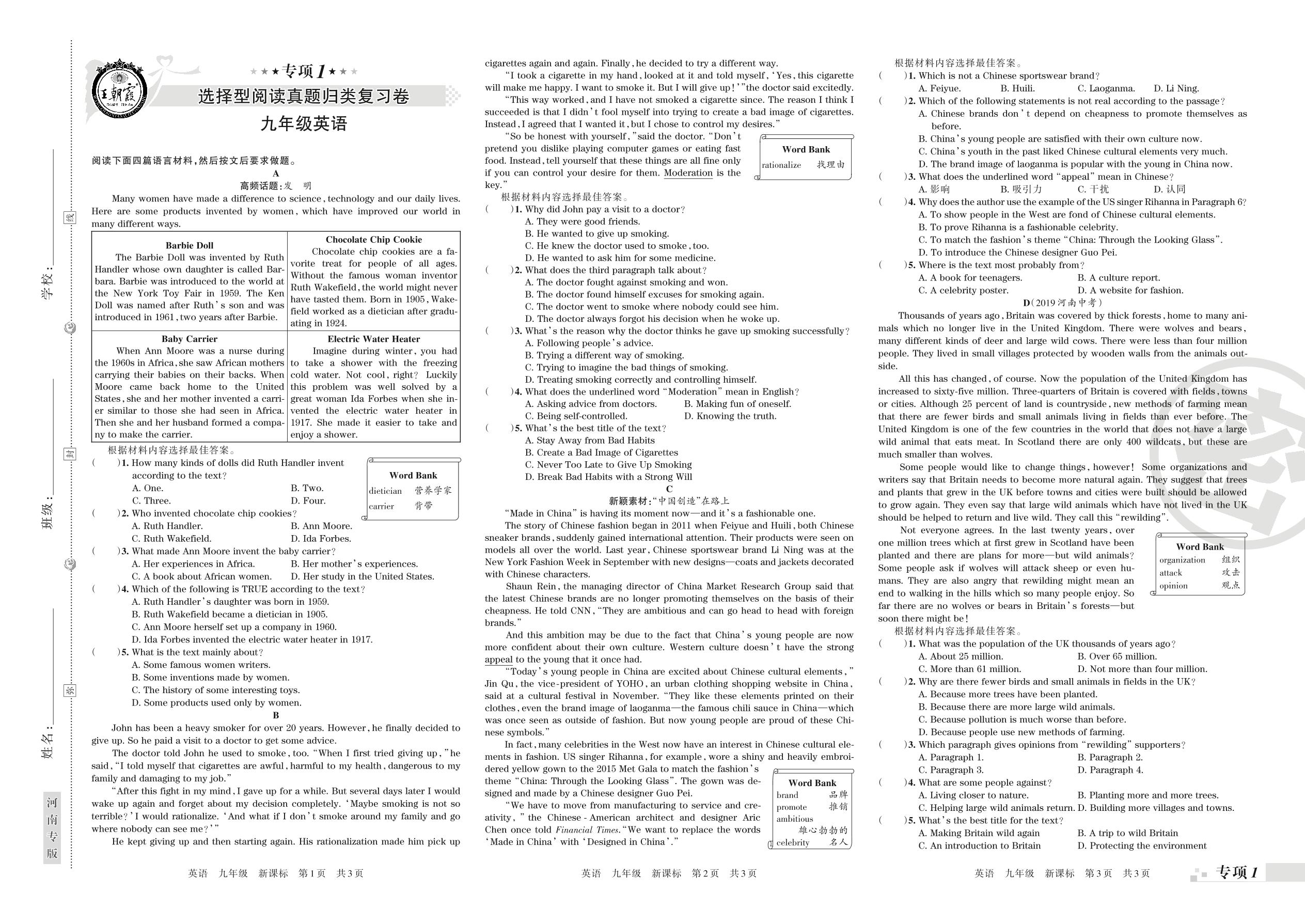 王朝霞期末专项卷——选择型阅读、任务型阅读真题归类复习九年级上册英语(新课版)【0】