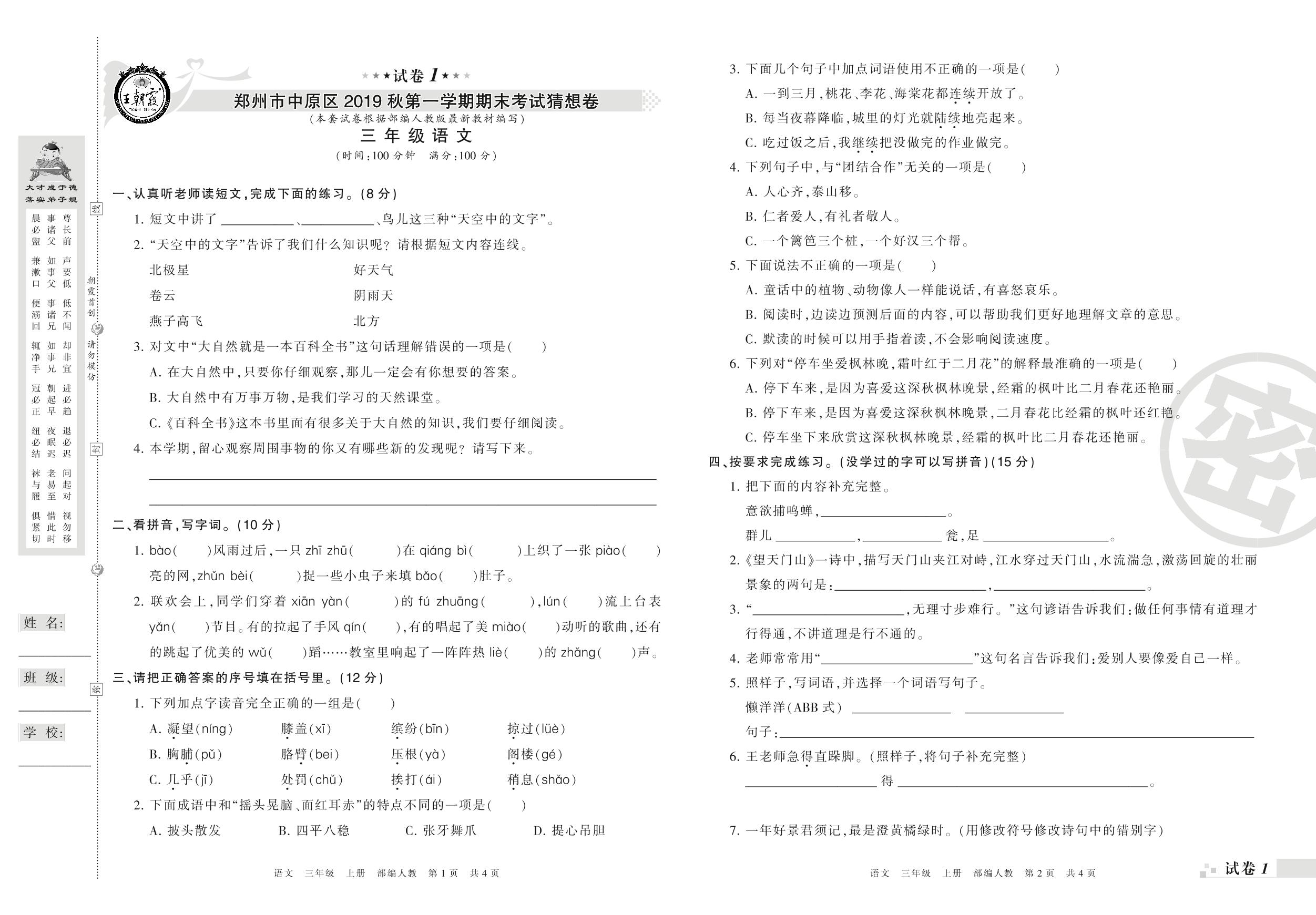 2018-2019学年第一学期郑州市中原区猜想卷三年级语文试卷(人教版)_R21080192100【1】