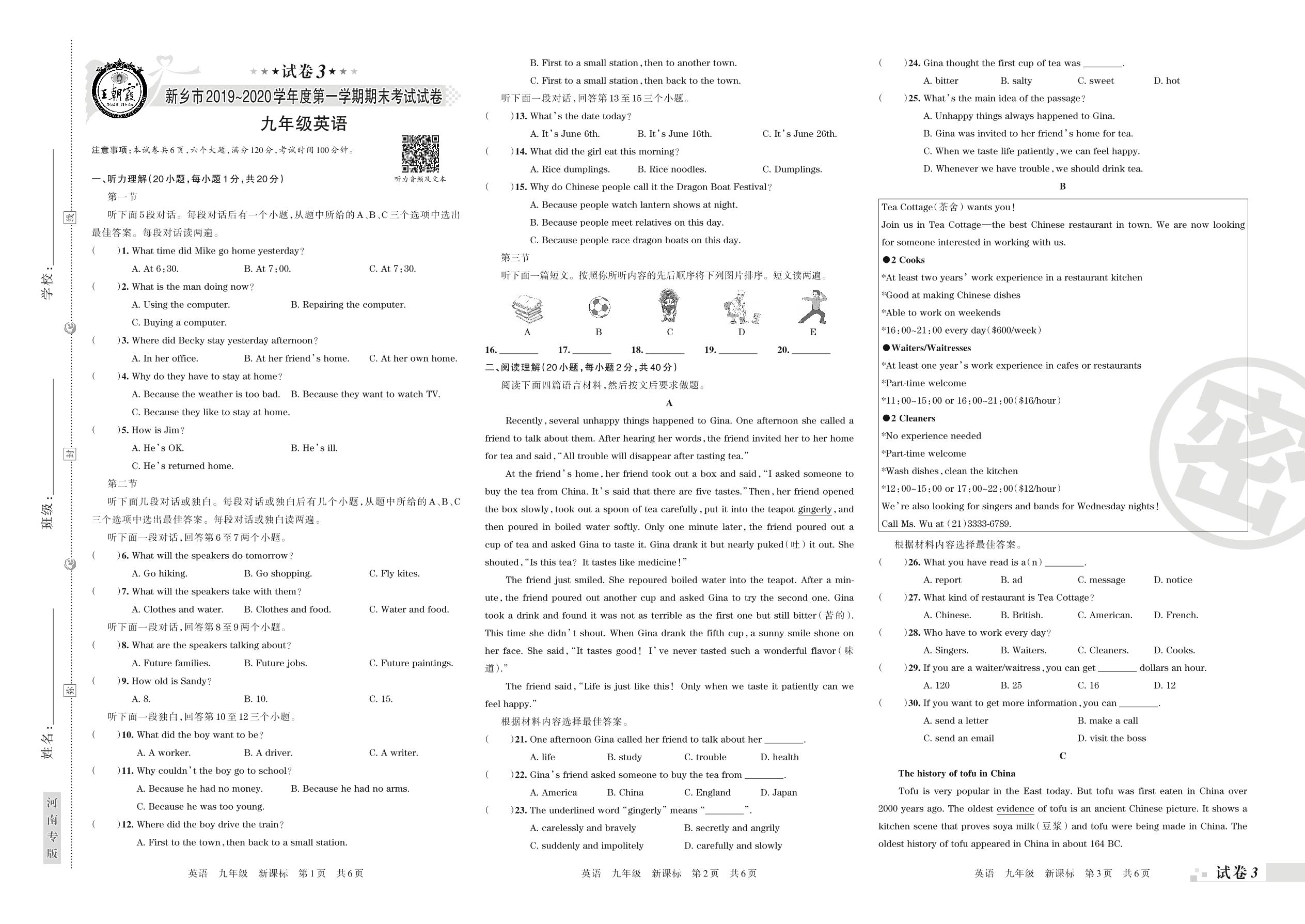 2019-2020学年第一学期新乡市九年级英语试卷(新课版)【3】