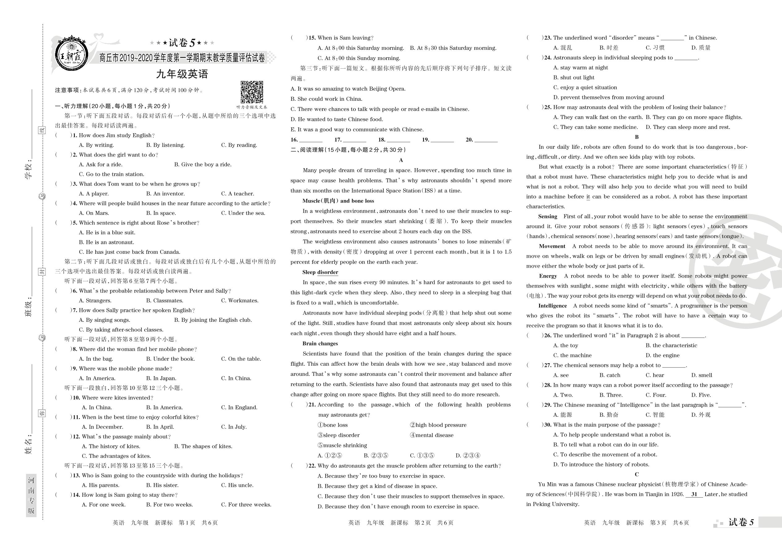 2019-2020学年第一学期商丘市九年级英语试卷(新课版)【5】
