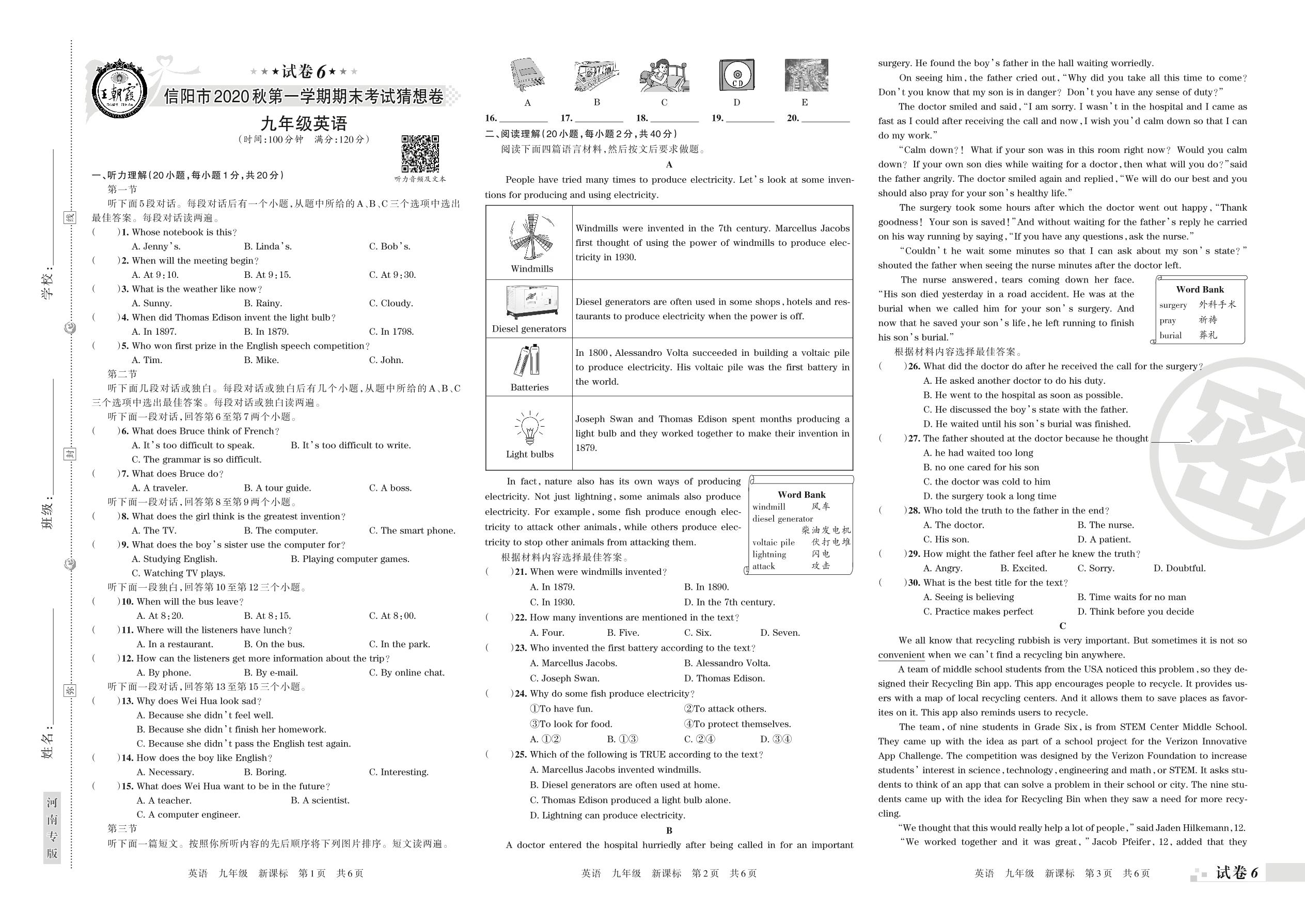 2019-2020学年第一学期信阳市猜想卷九年级英语试卷(新课版)【6】