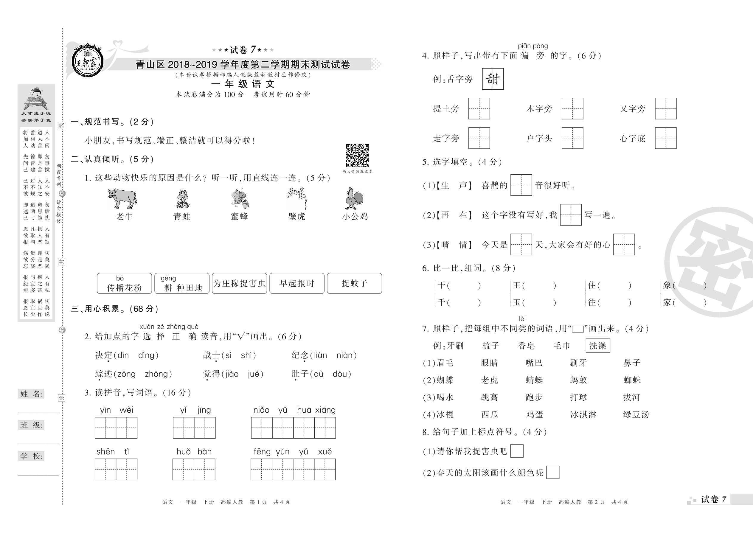 2018-2019学年第二学期武汉市青山区一年级语文试卷(人教版)【7】