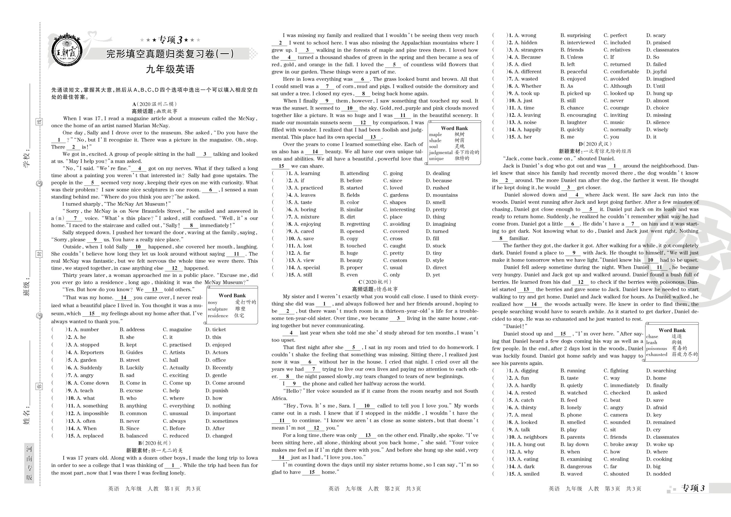 王朝霞期末专项卷——完形填空真题归类复习九年级上册英语(人教版)【0】
