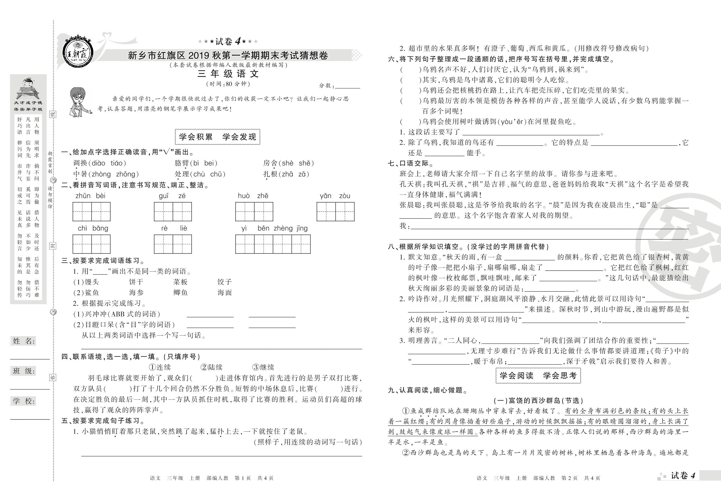 2018-2019学年第一学期新乡市红旗区猜想卷三年级语文试卷(人教版)【4】