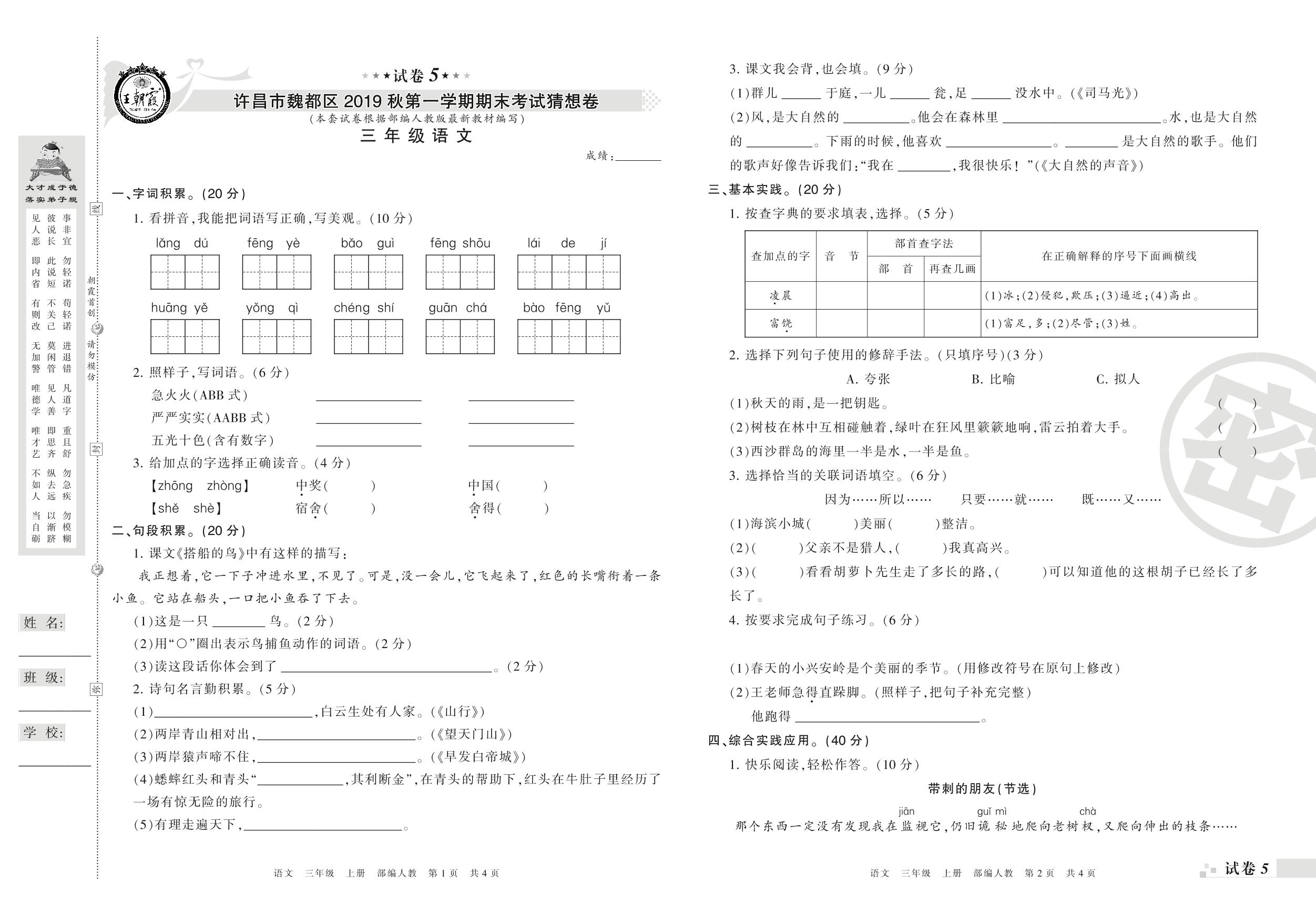 2018-2019学年第一学期许昌市魏都区猜想卷三年级语文试卷(人教版)【5】