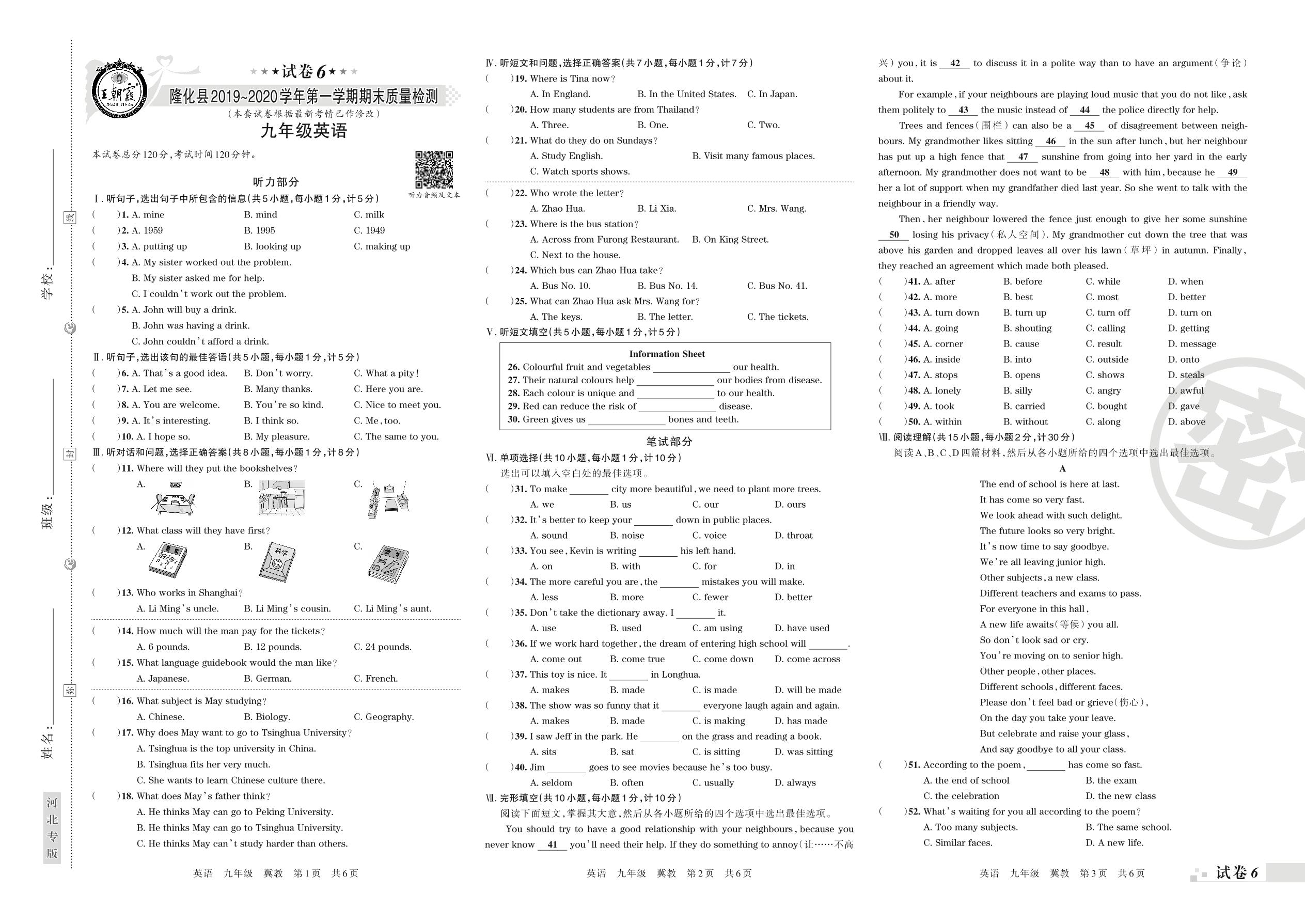 2019-2020学年第一学期承德市隆化县九年级英语试卷(冀教版)【6】