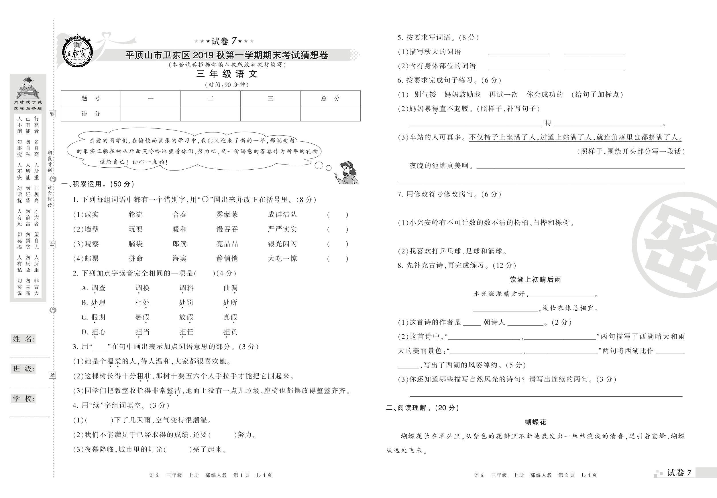 2018-2019学年第一学期平顶山市卫东区猜想卷三年级语文试卷(人教版)【7】