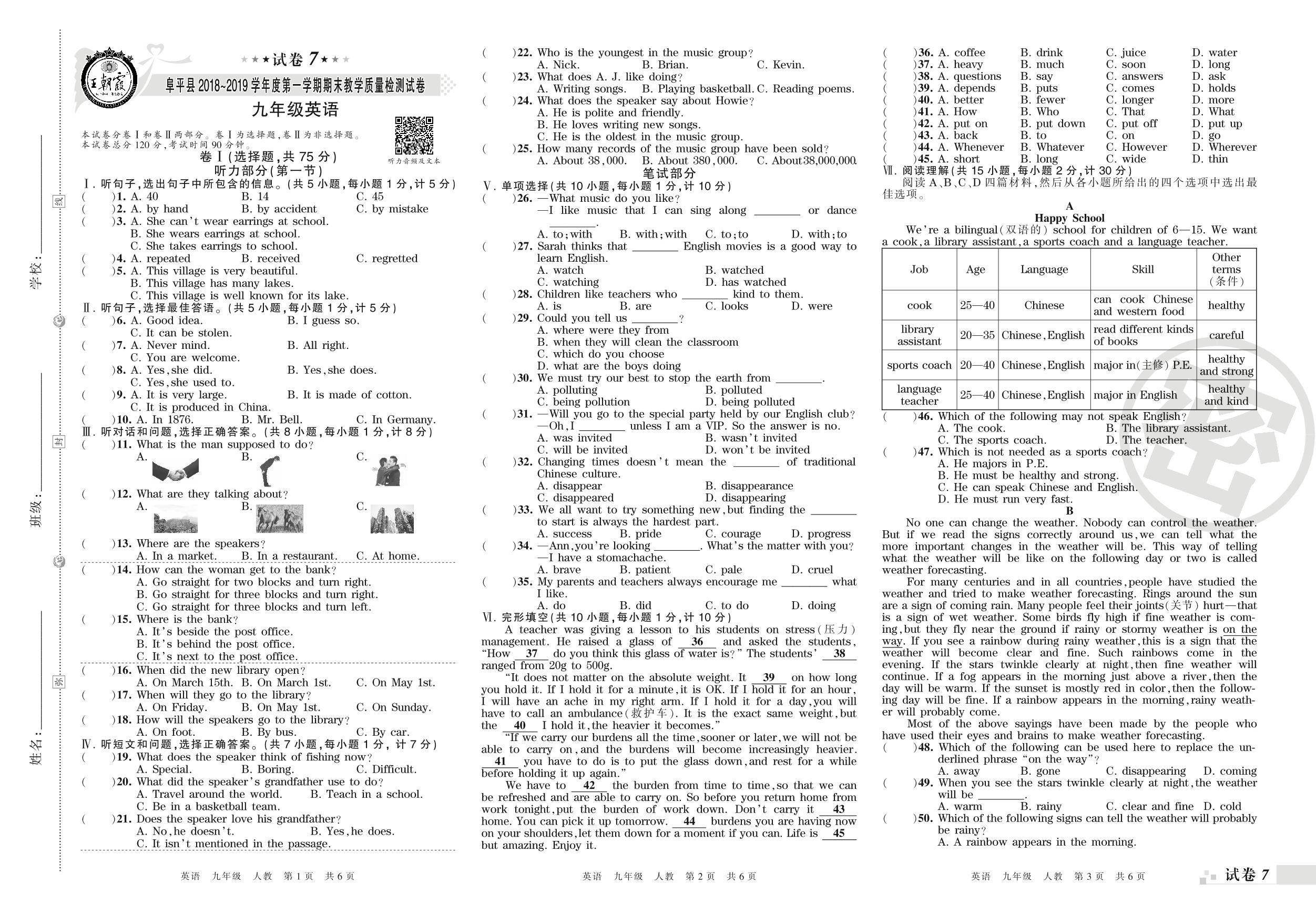 2018-2019学年第一学期保定市阜平县九年级英语试卷(人教版)【7】
