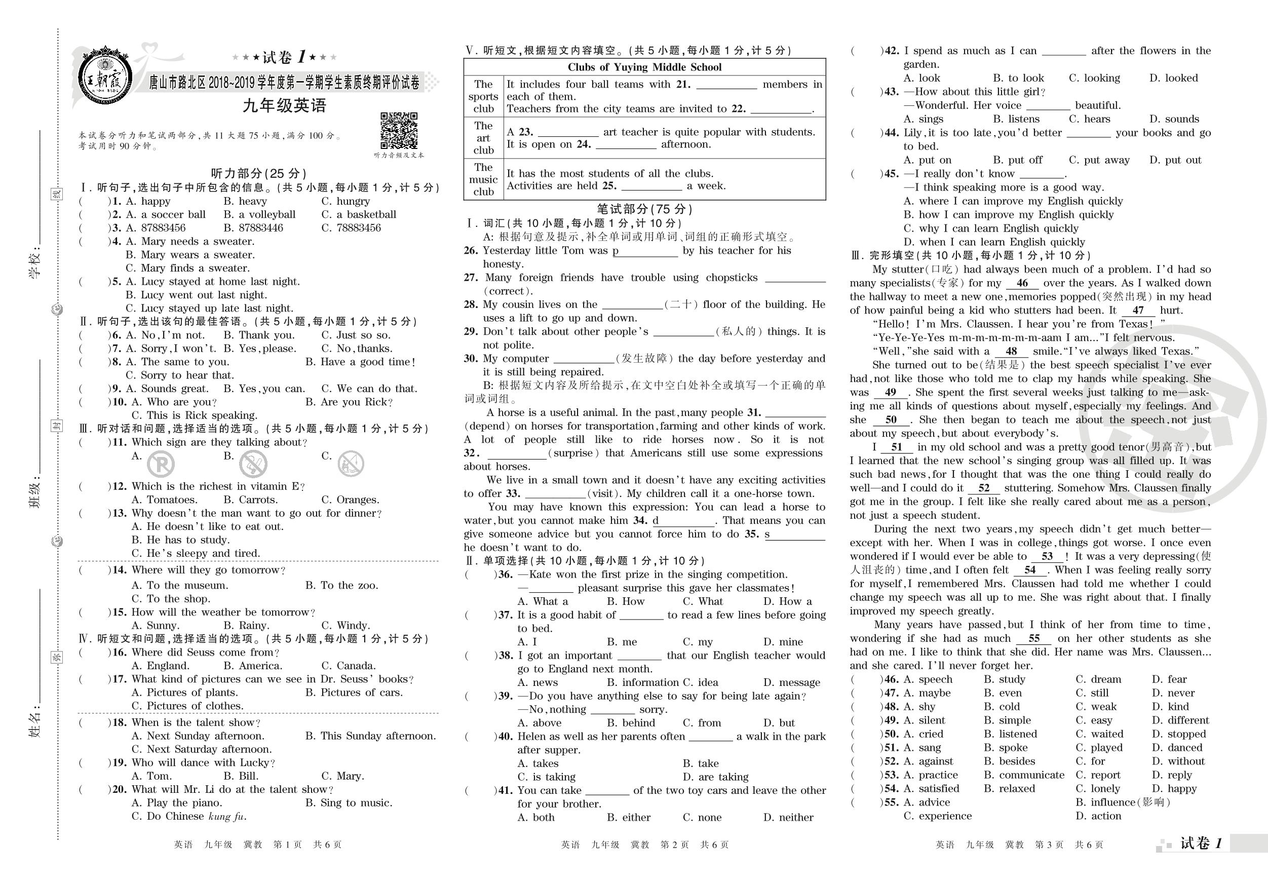2018-2019学年第一学期唐山市路北区九年级英语试卷(冀教版)【1】