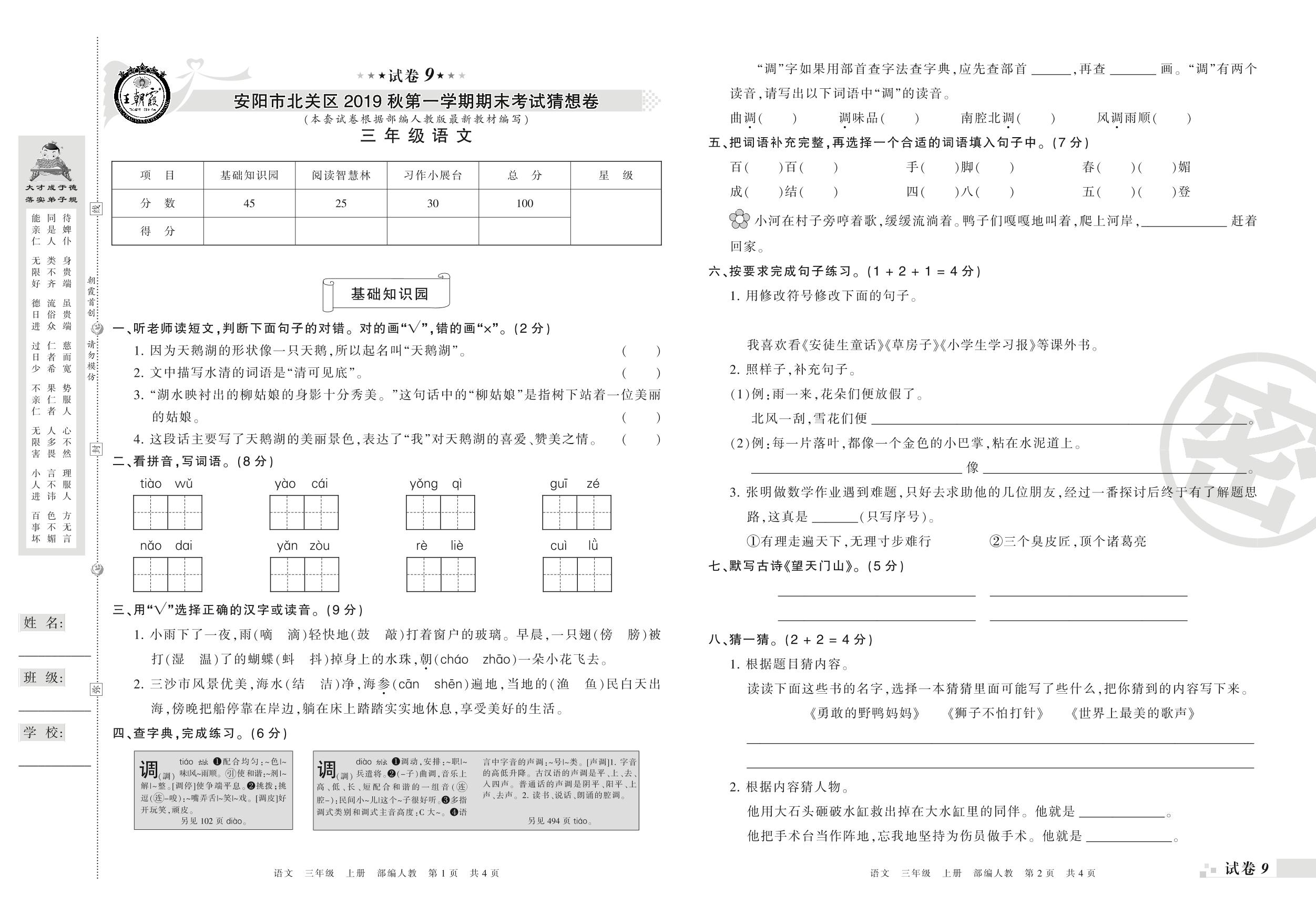 2018-2019学年第一学期安阳市北关区猜想卷三年级语文试卷(人教版)【9】