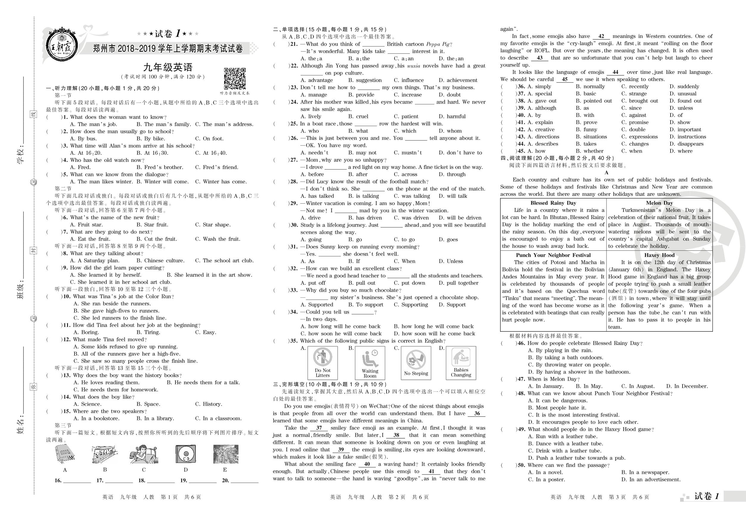 2018-2019学年第一学期郑州市九年级英语试卷(人教版)【1】