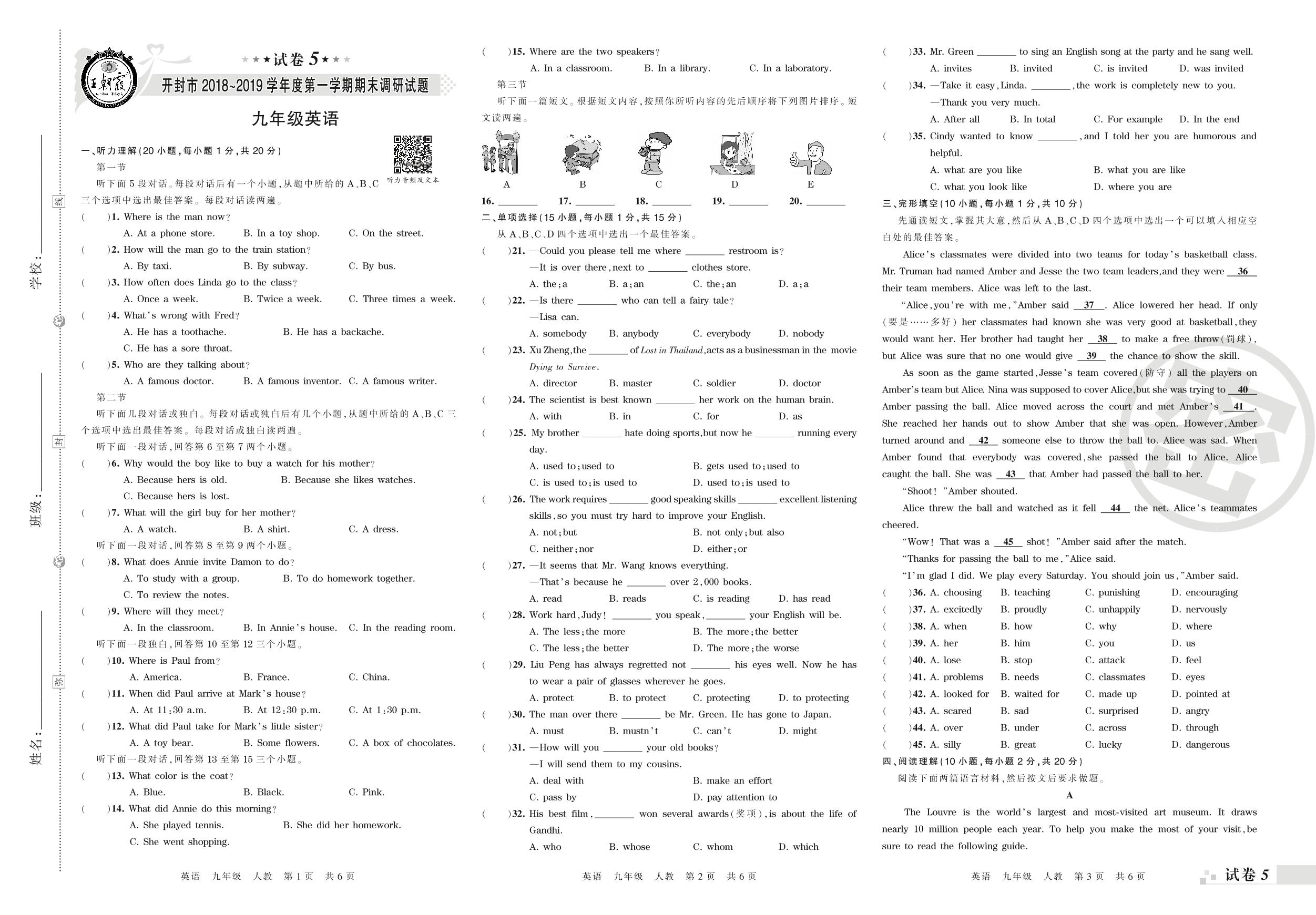 2018-2019学年第一学期开封市九年级英语试卷(人教版)【5】