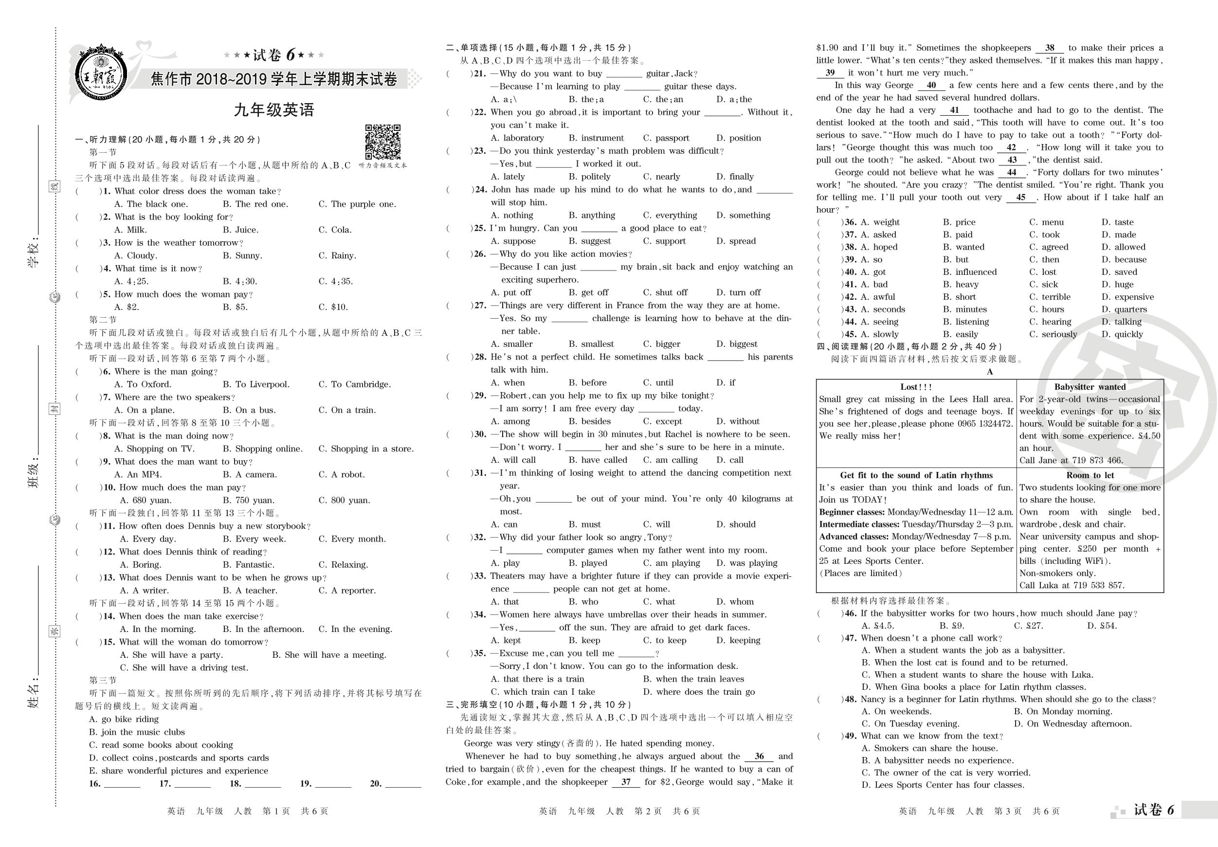 2018-2019学年第一学期焦作市九年级英语试卷(人教版)【6】