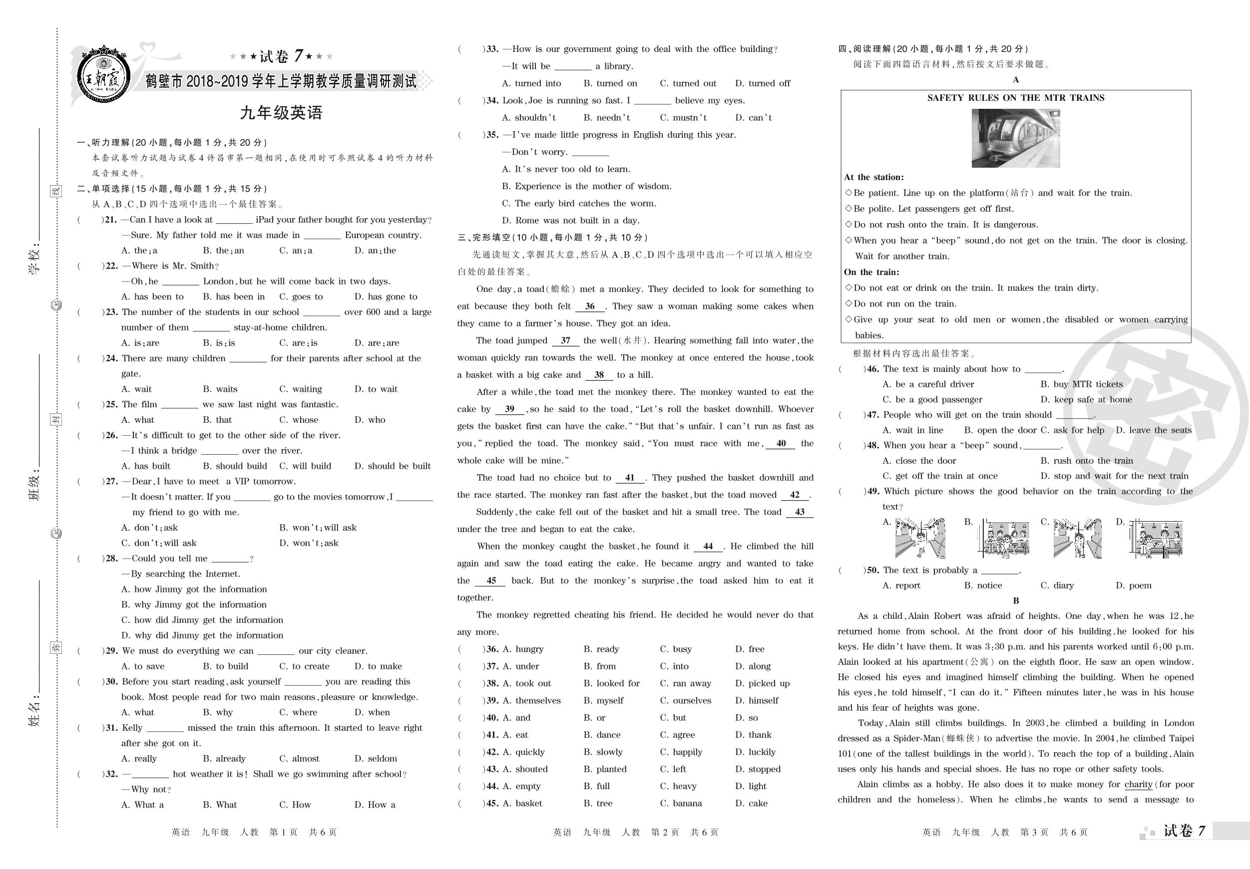 2018-2019学年第一学期鹤壁市九年级英语试卷(人教版)【7】