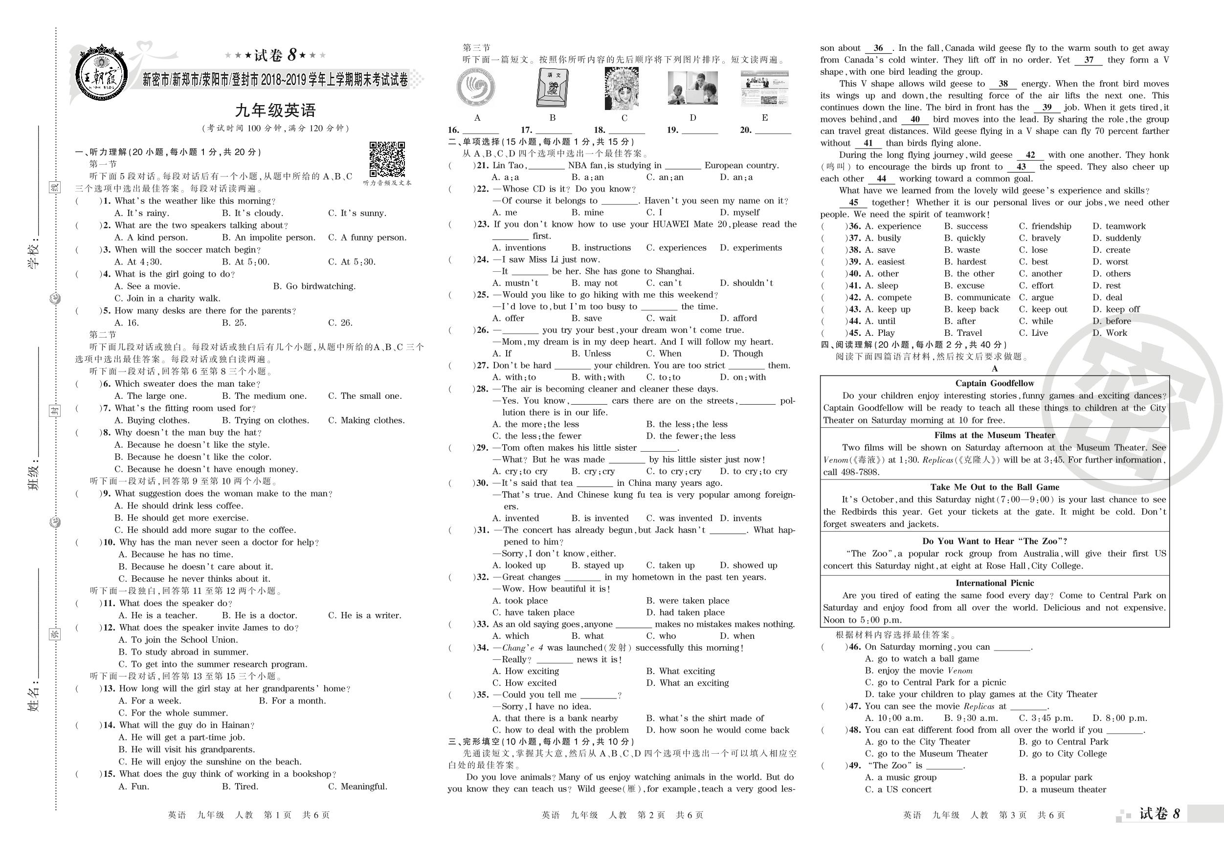 2018-2019学年第一学期新密市、新郑市、荥阳市、登封市九年级英语试卷(人教版)【8】