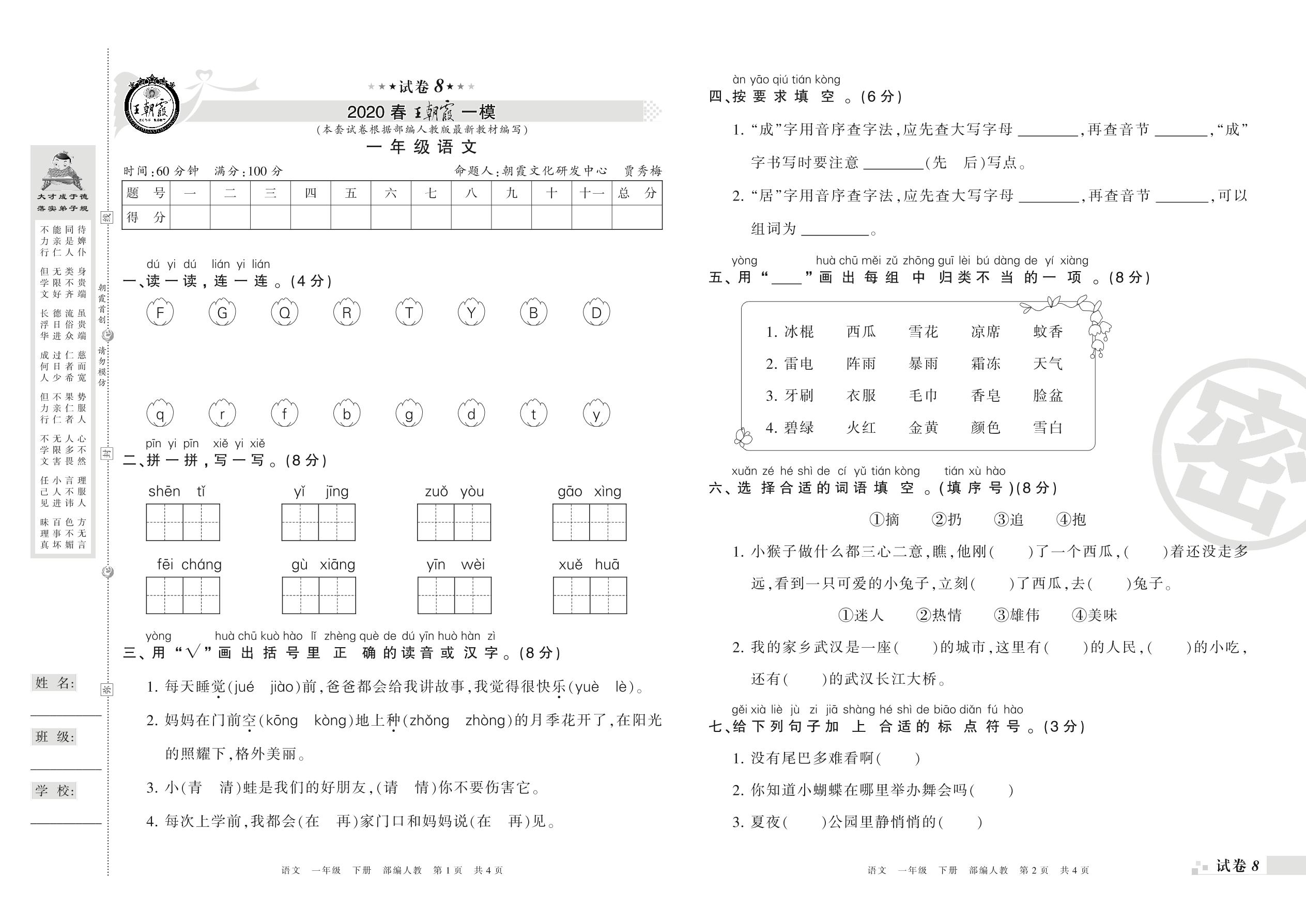 王朝霞期末模拟卷一年级下册语文(人教版)_R210731175705【8】