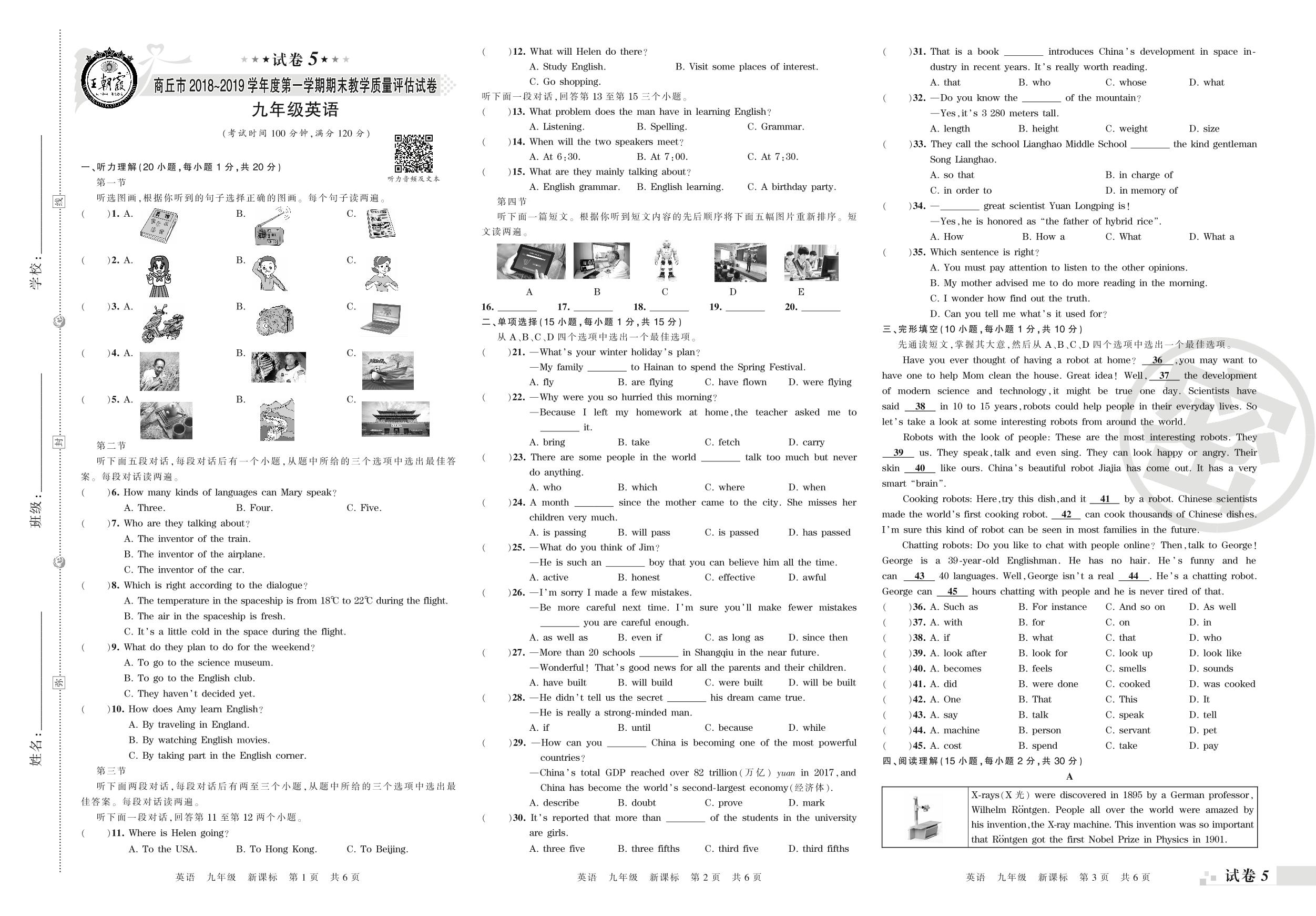 2018-2019学年第一学期商丘市九年级英语试卷(新课版)【5】