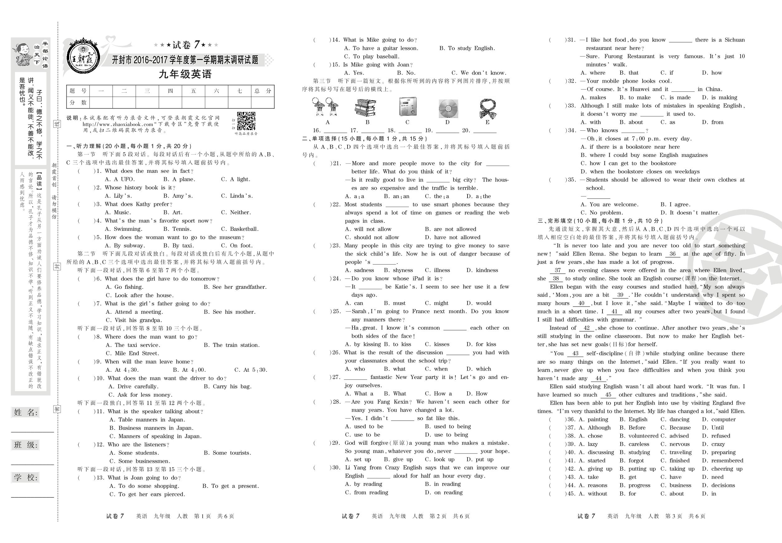 2016-2017学年第一学期开封市九年级英语试卷(人教版)【7】