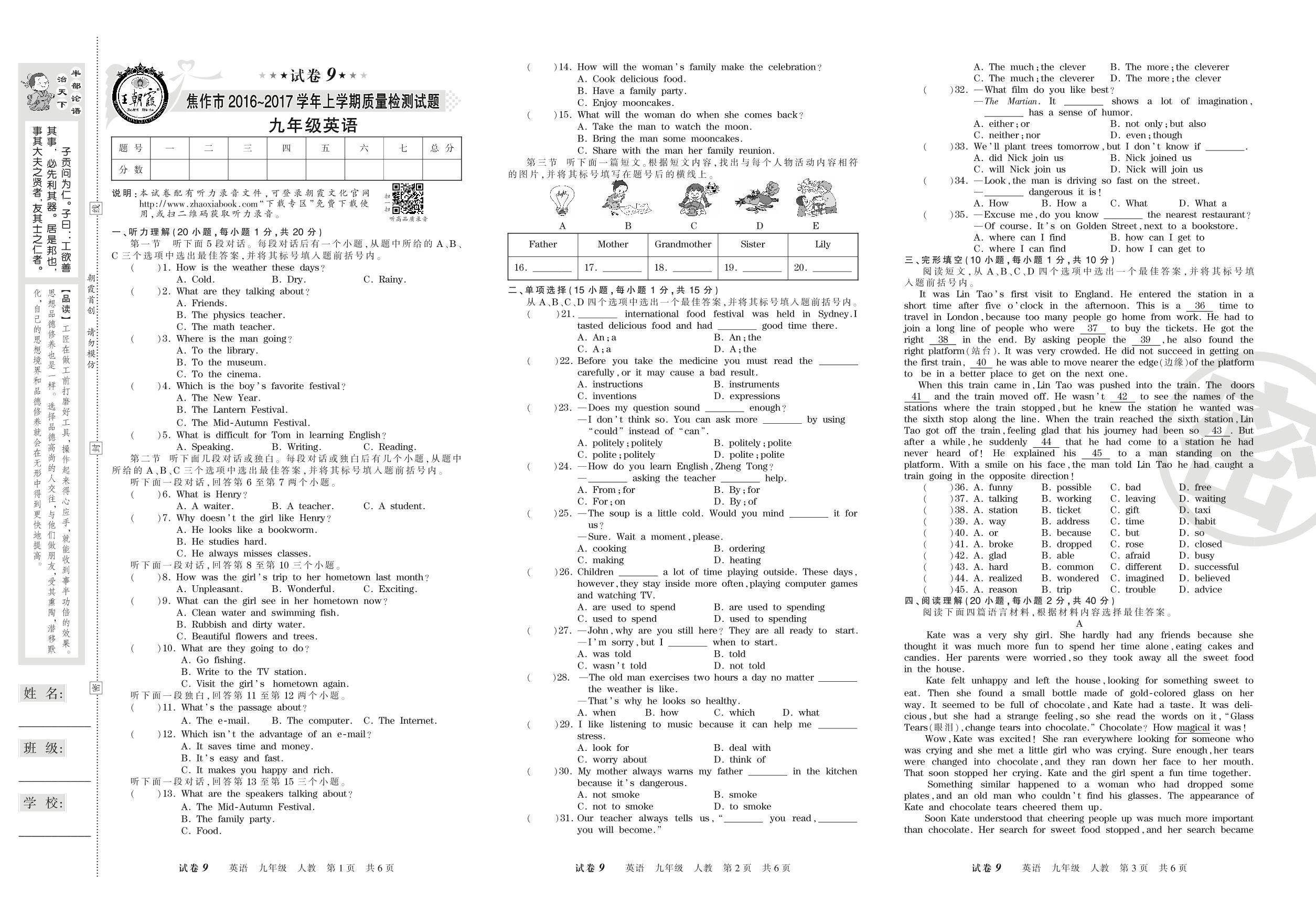 2016-2017学年第一学期焦作市九年级英语试卷(人教版)【9】