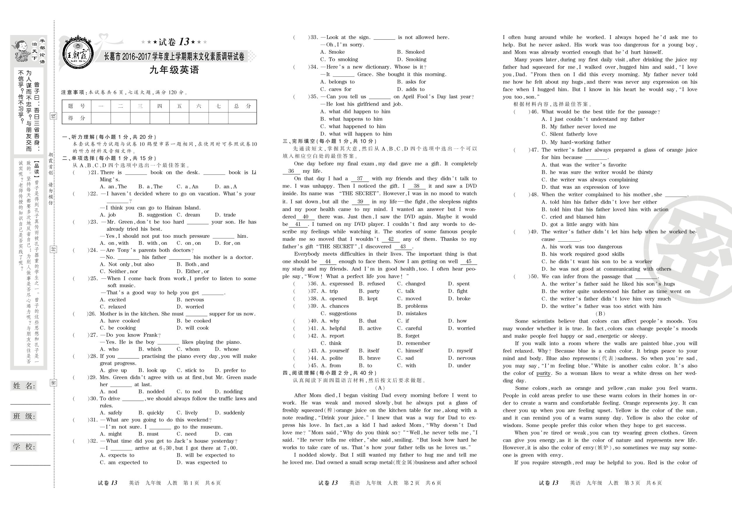 2016-2017学年第一学期长葛市九年级英语试卷(人教版)【13】