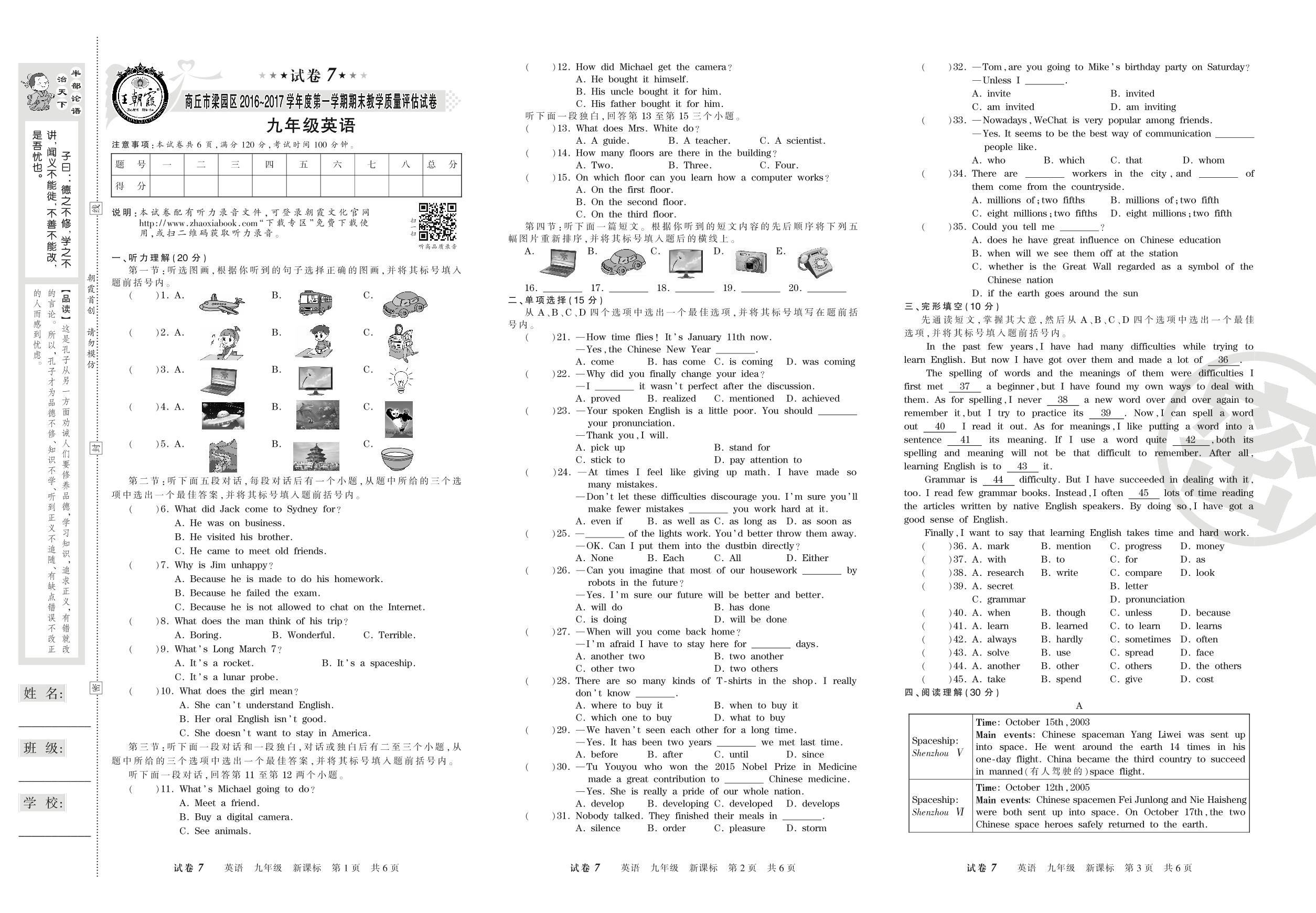 2016-2017学年第一学期商丘市梁园区九年级英语试卷(新课版)【7】