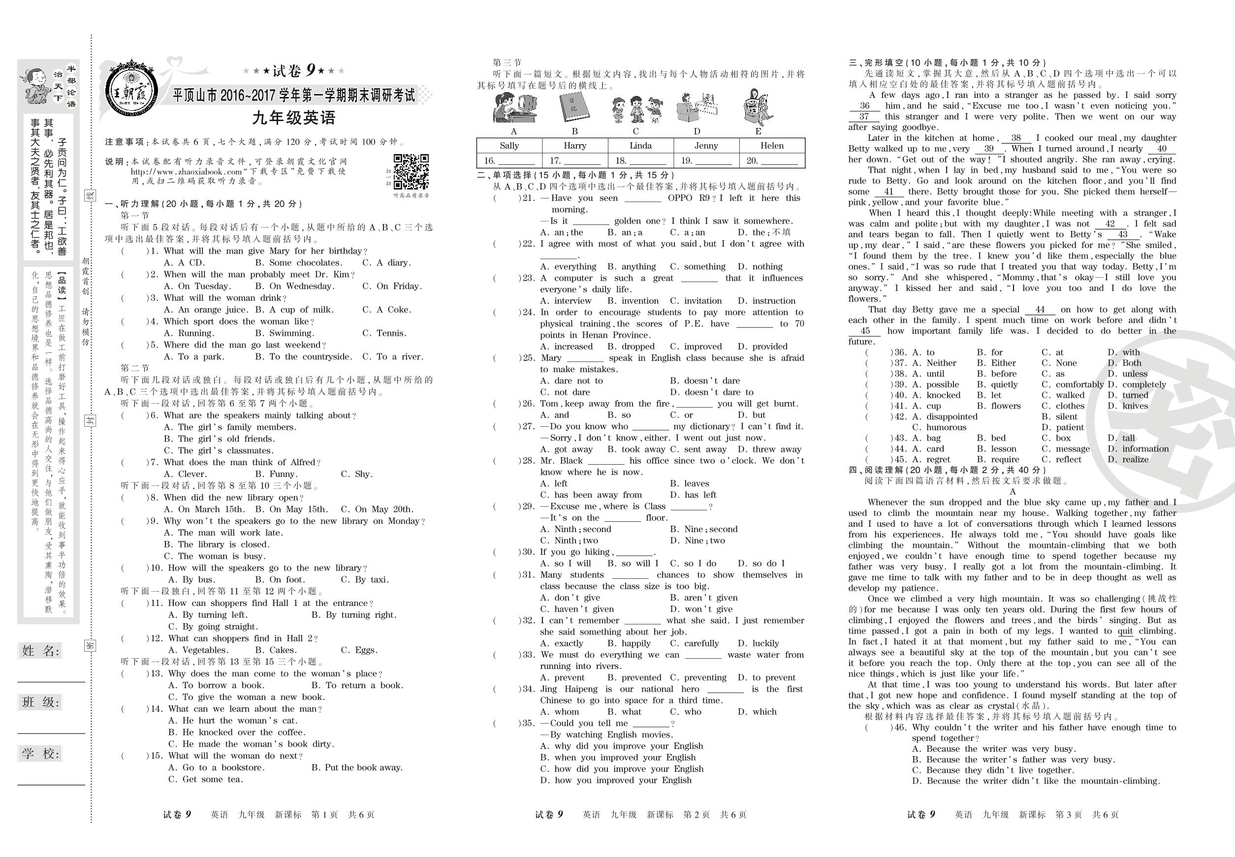 2016-2017学年第一学期平顶山市九年级英语试卷(新课版)【9】