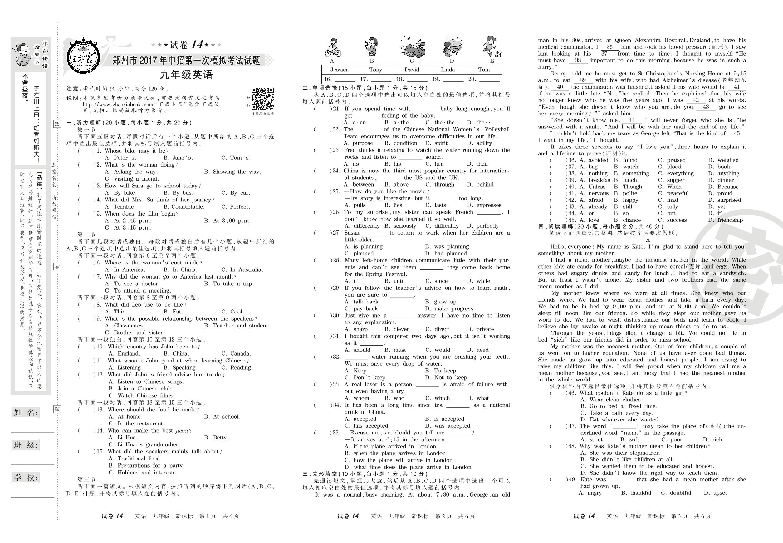2016-2017学年第一学期郑州市九年级英语试卷(新课版)【14】