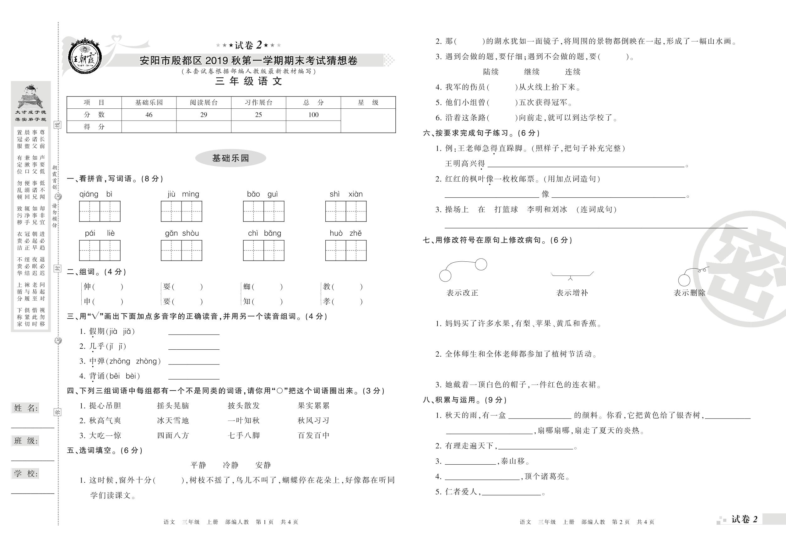 2018-2019学年第一学期安阳市殷都区猜想卷三年级语文试卷(人教版)【2】