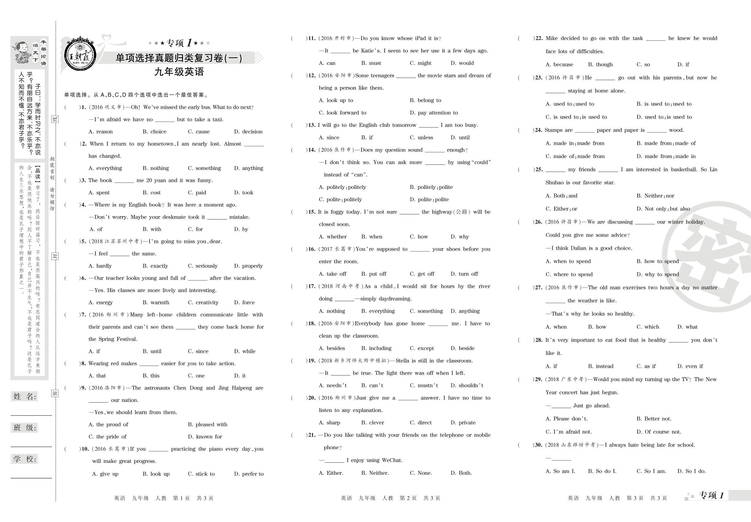 王朝霞期末专项卷——单项选择(一)(二)真题归类复习卷九年级上册英语(人教版)_R21081091634【0】