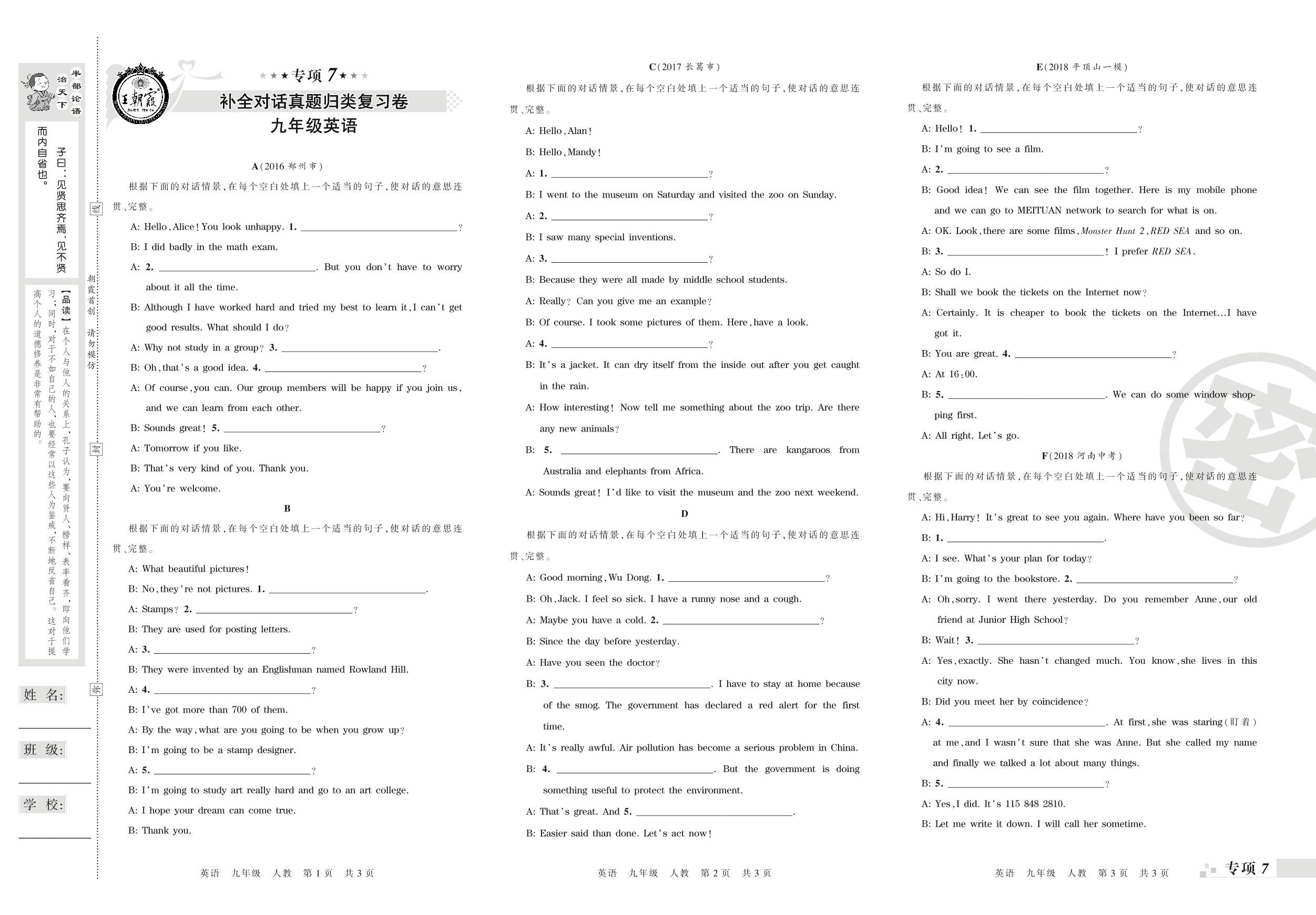 王朝霞期末专项卷——补全对话、书面表达真题归类复习卷九年级上册英语(人教版)_R21081091651【0】