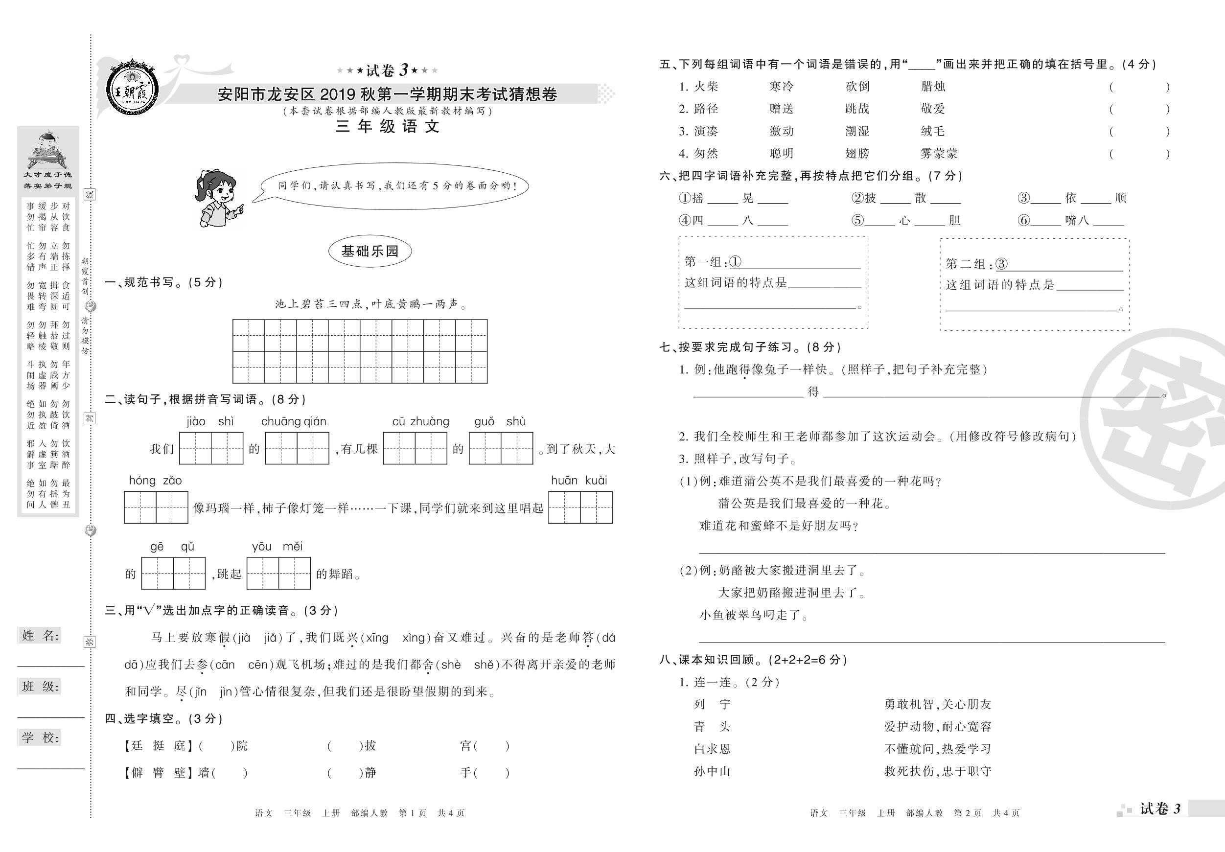 2018-2019学年第一学期安阳市龙安区猜想卷三年级语文试卷(人教版)【3】