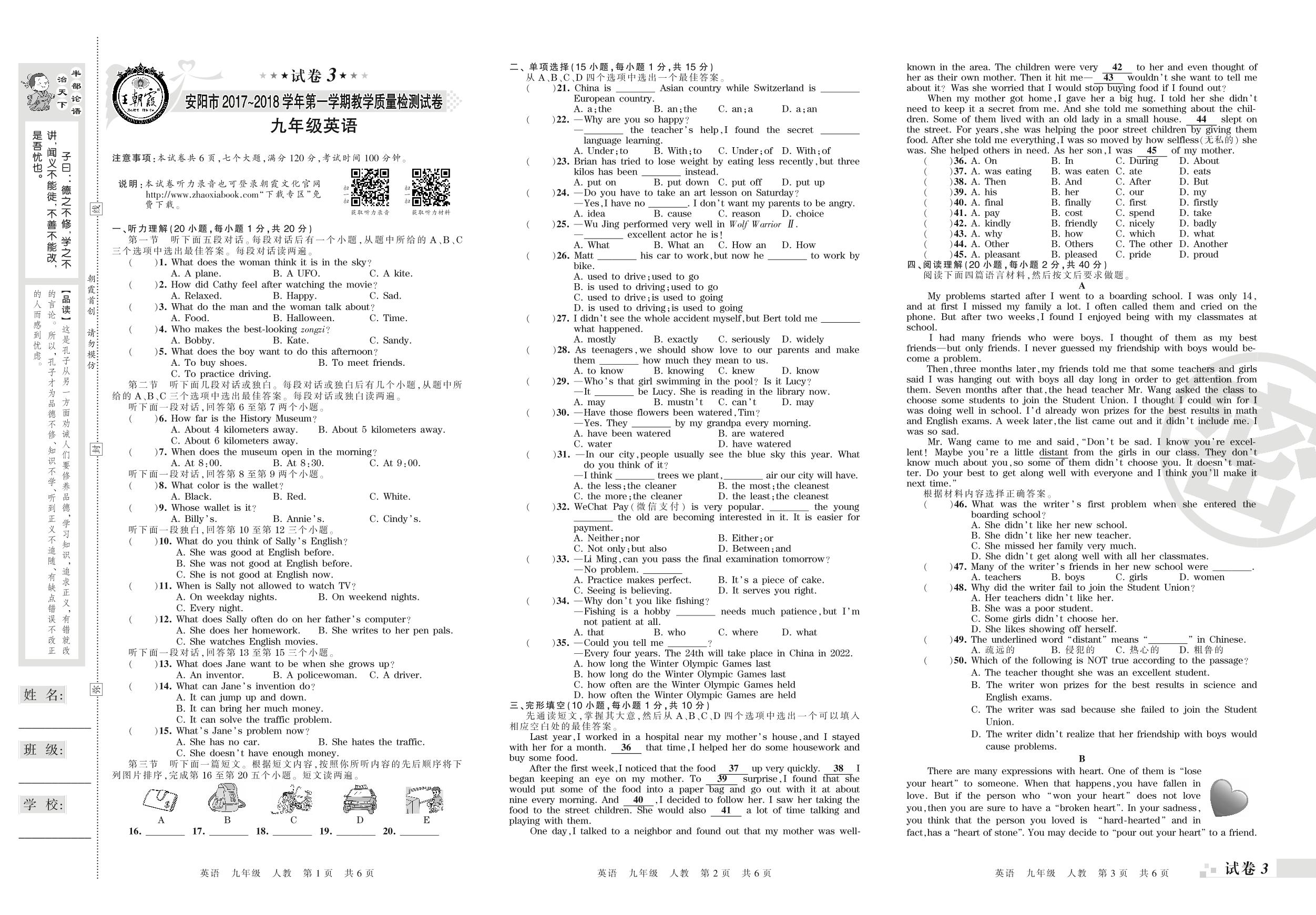 2017-2018学年第一学期安阳市九年级英语试卷(人教版)【3】