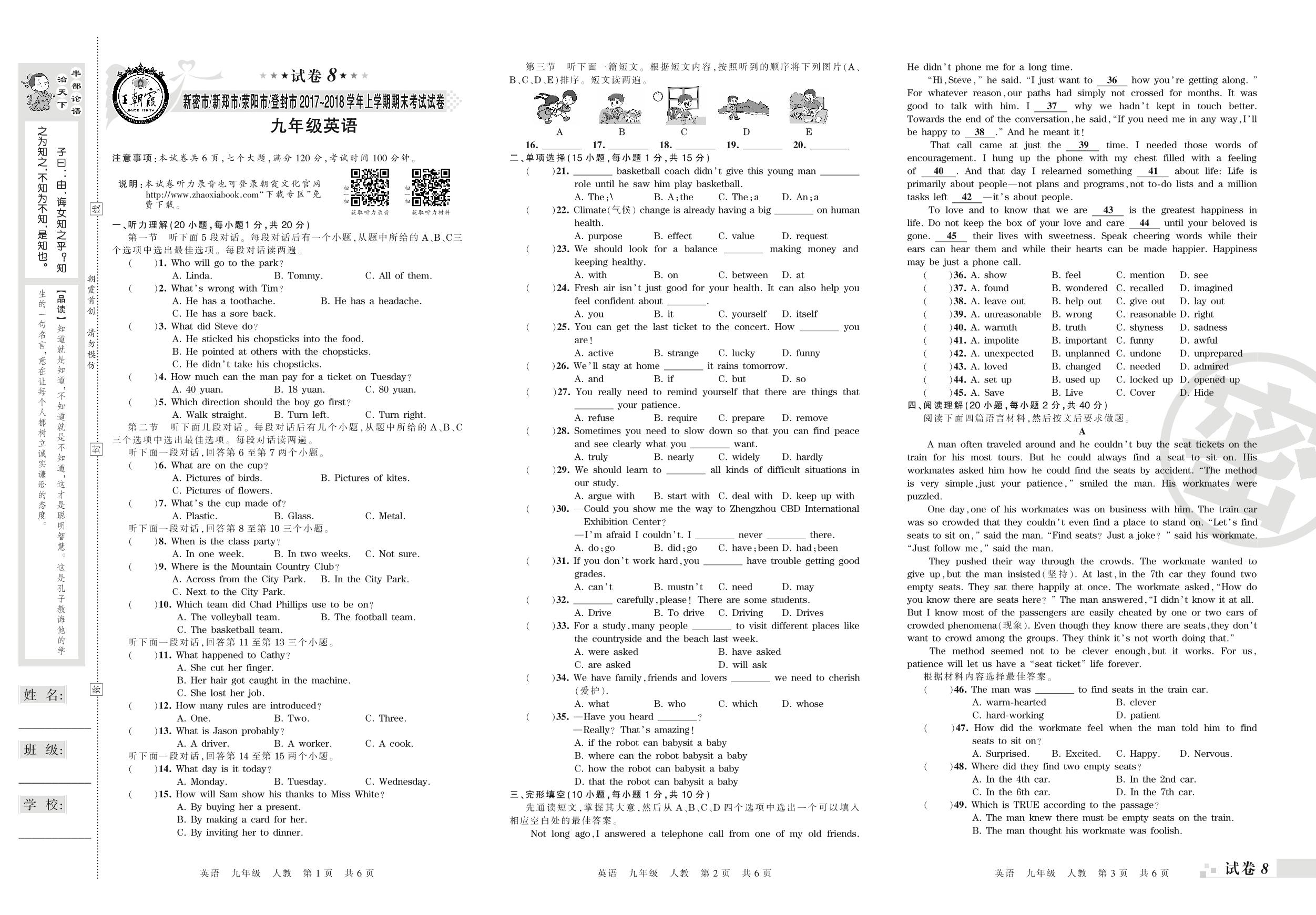 2017-2018学年第一学期新密市 新郑市 荥阳市 登封市九年级英语试卷(人教版)【8】