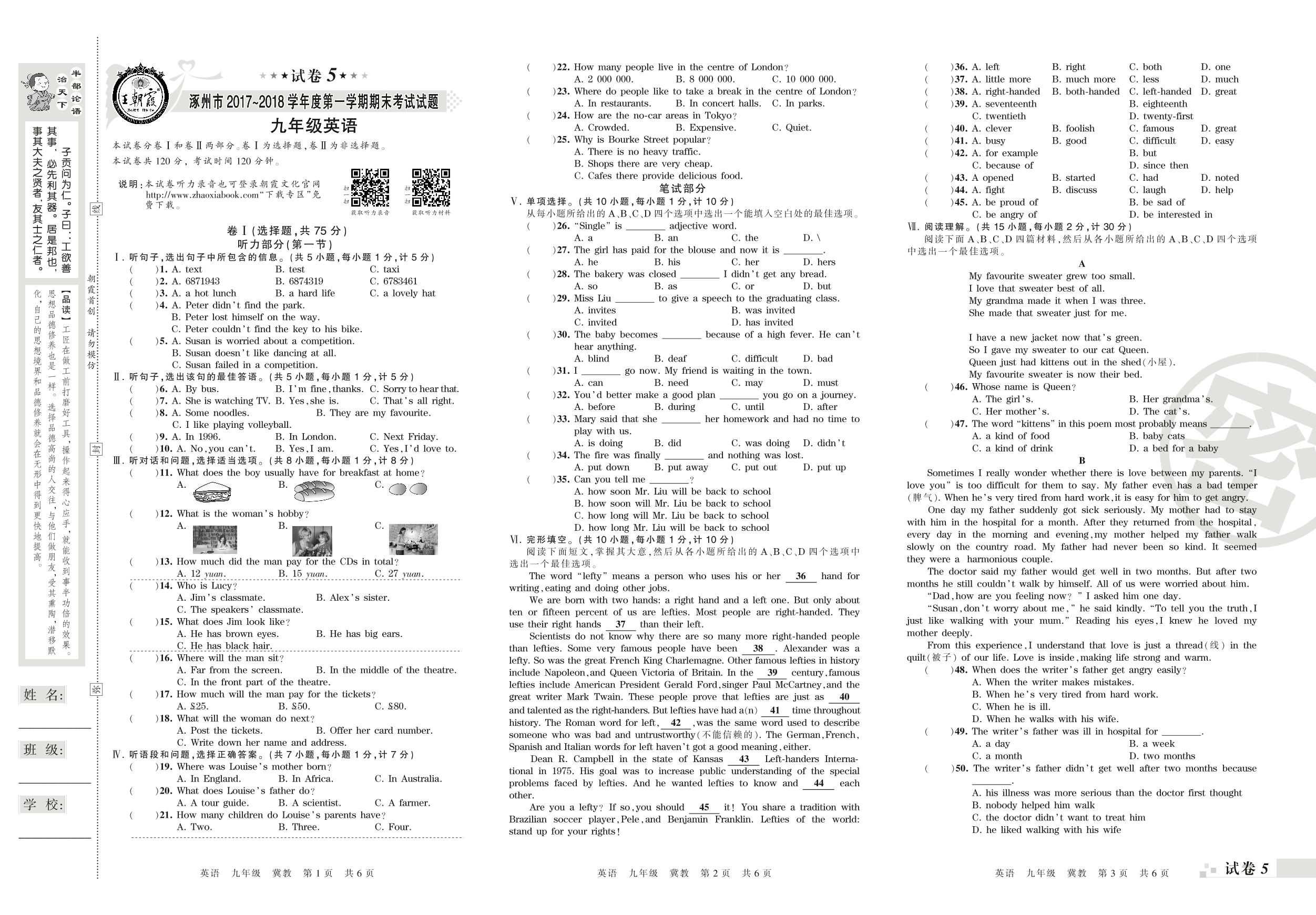 2017-2018学年第一学期涿州市九年级英语试卷(冀教版)【5】