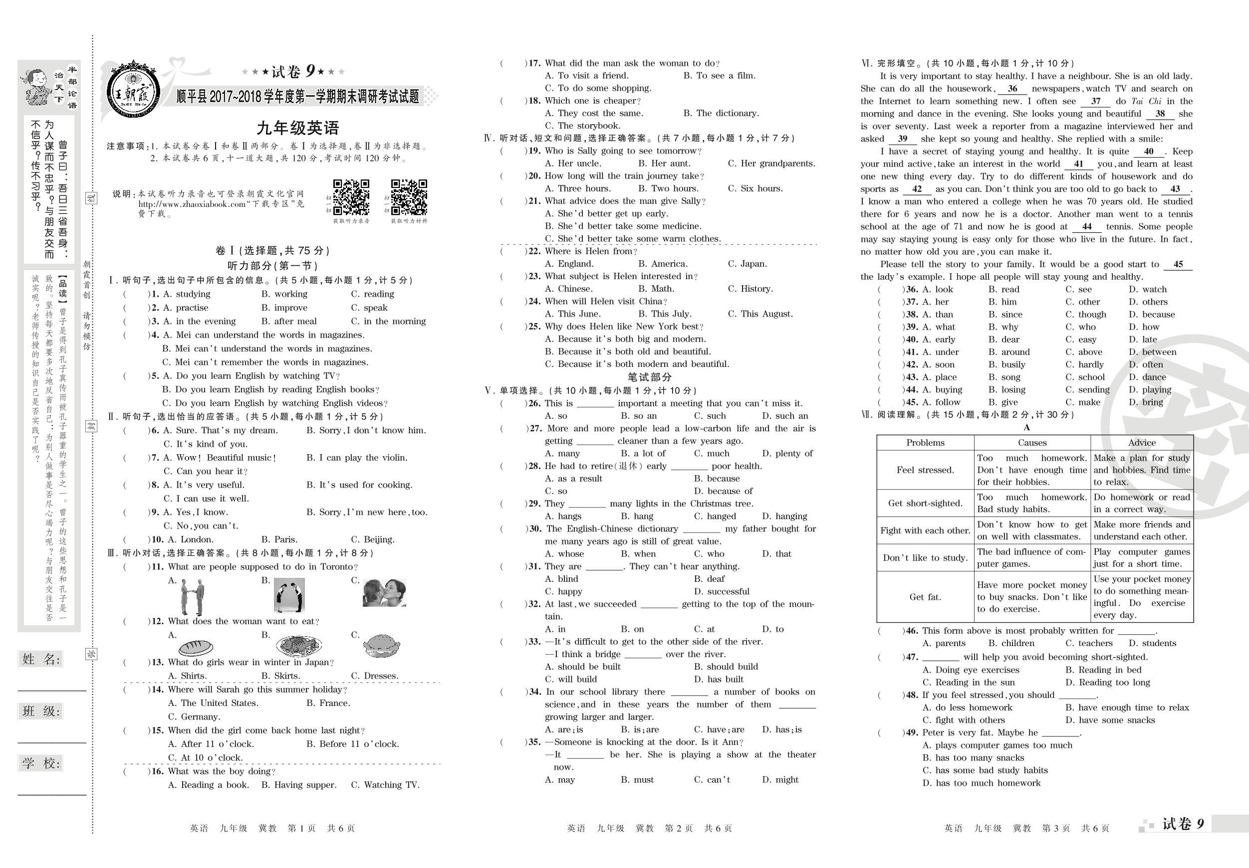 2017-2018学年第一学期保定市顺平县九年级英语试卷(冀教版)【9】