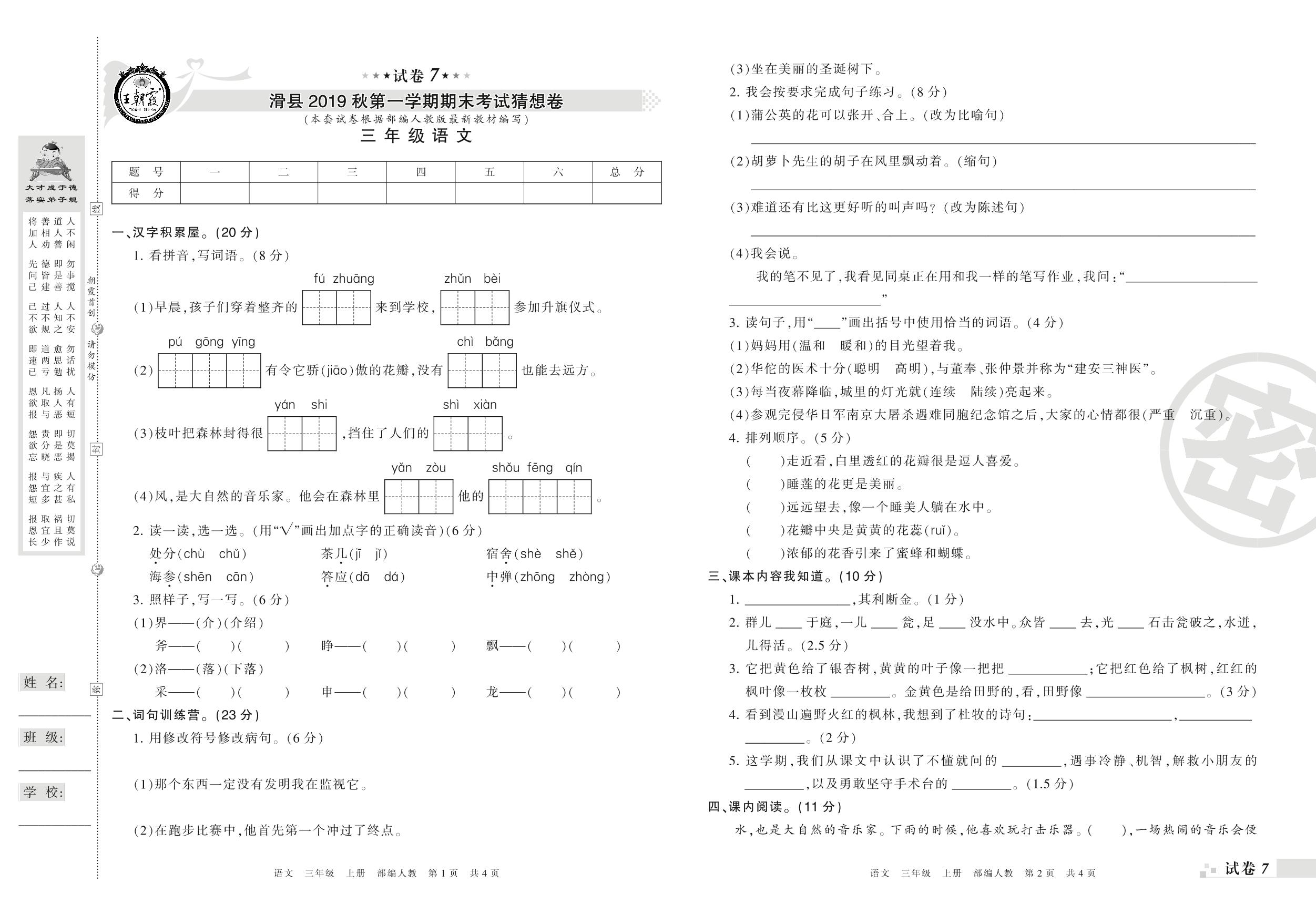 2018-2019学年第一学期安阳市滑县猜想卷三年级语文试卷(人教版)【7】