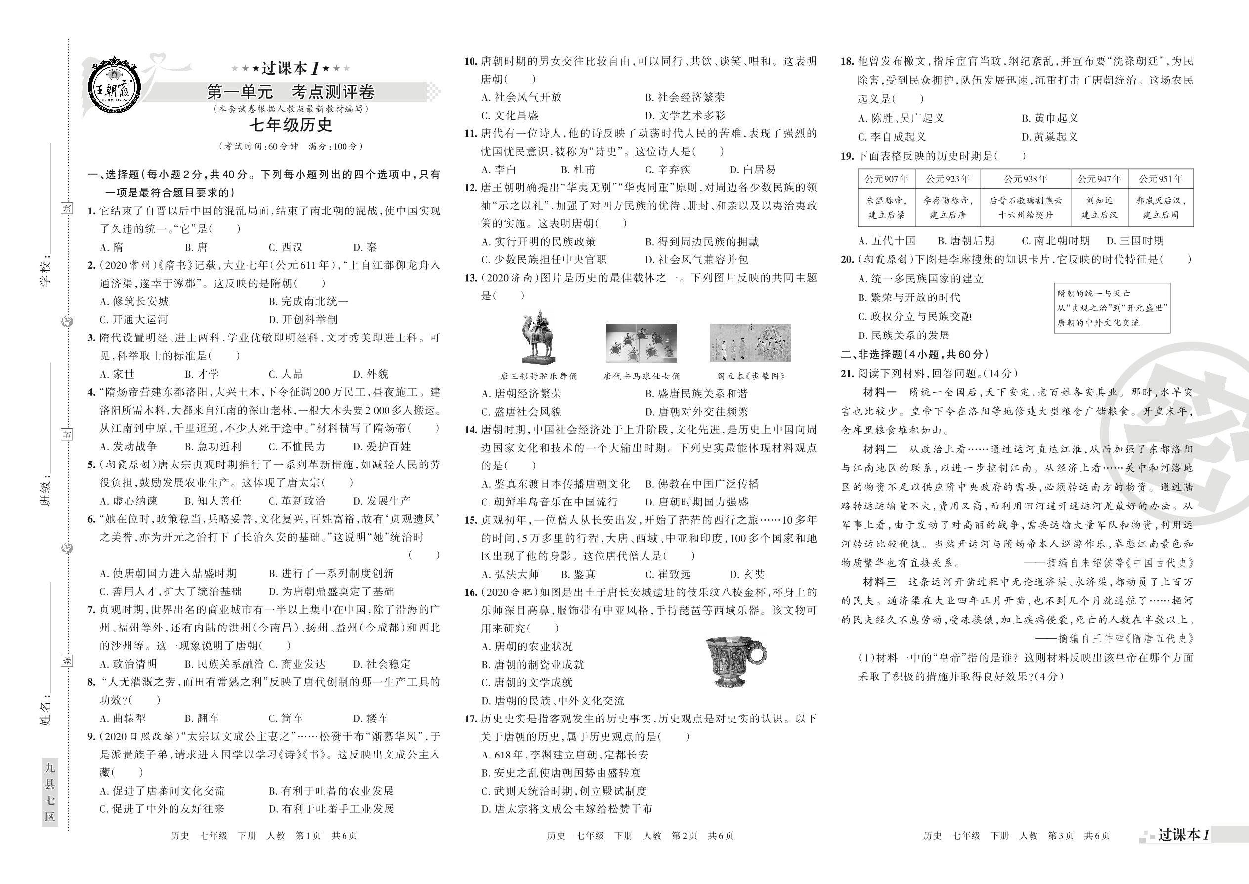 王朝霞期末过课本——第一单元考点测评卷七年级下册历史(人教版)_R210810100018【1】