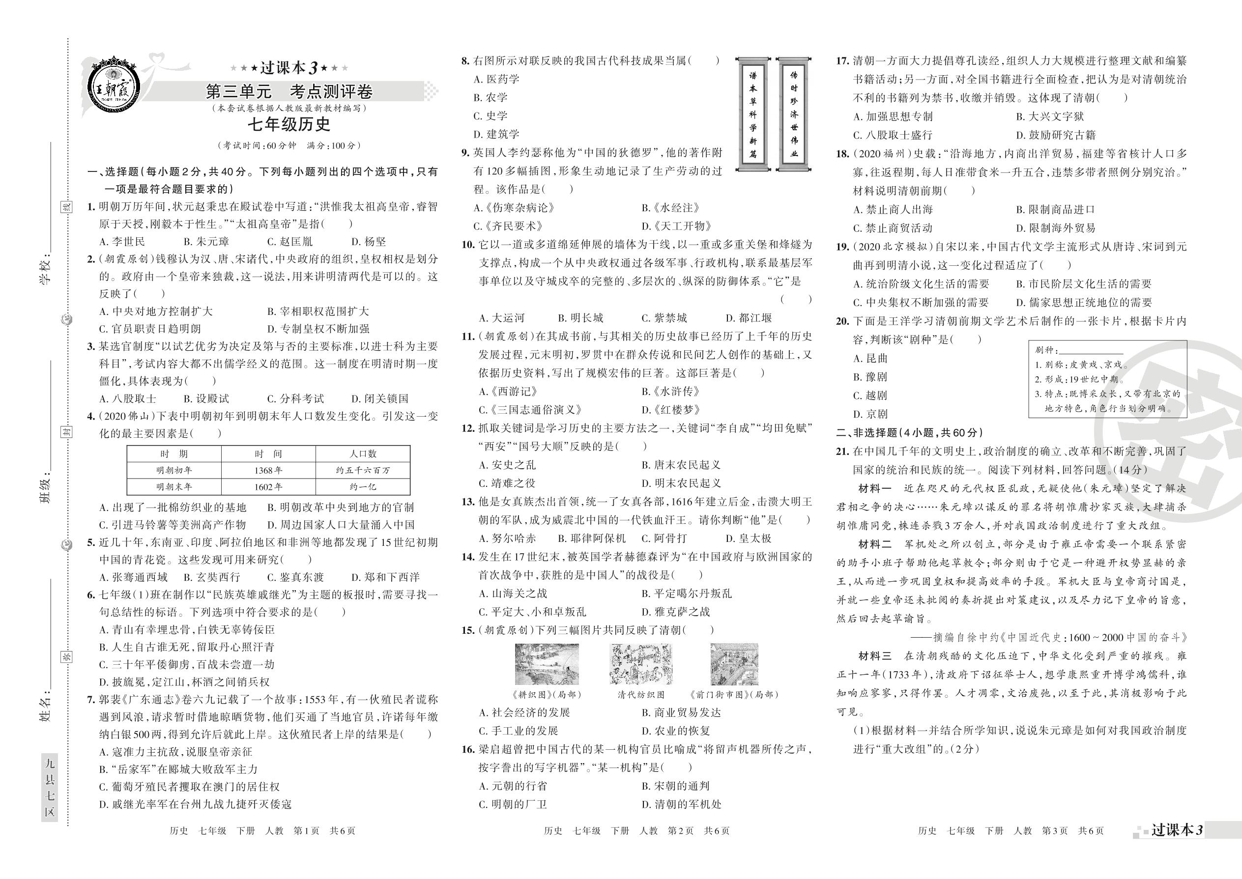 王朝霞期末过课本——第三单元考点测评卷七年级下册历史(人教版)_R210810100032【3】