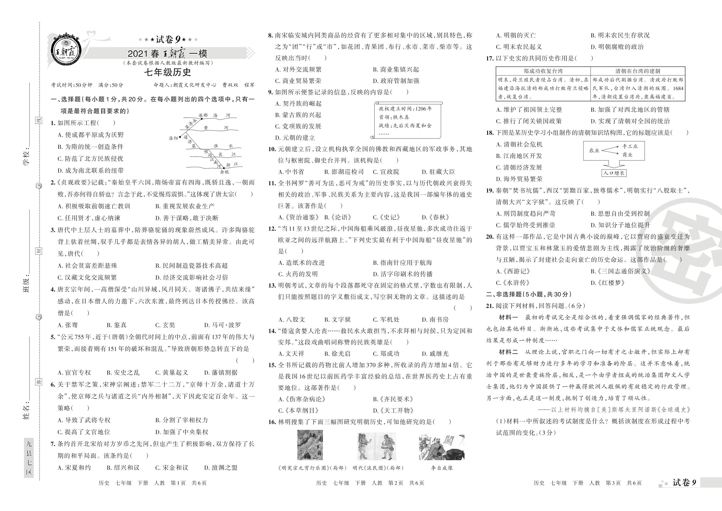 王朝霞期末模拟卷七年级下册历史(人教版)【9】