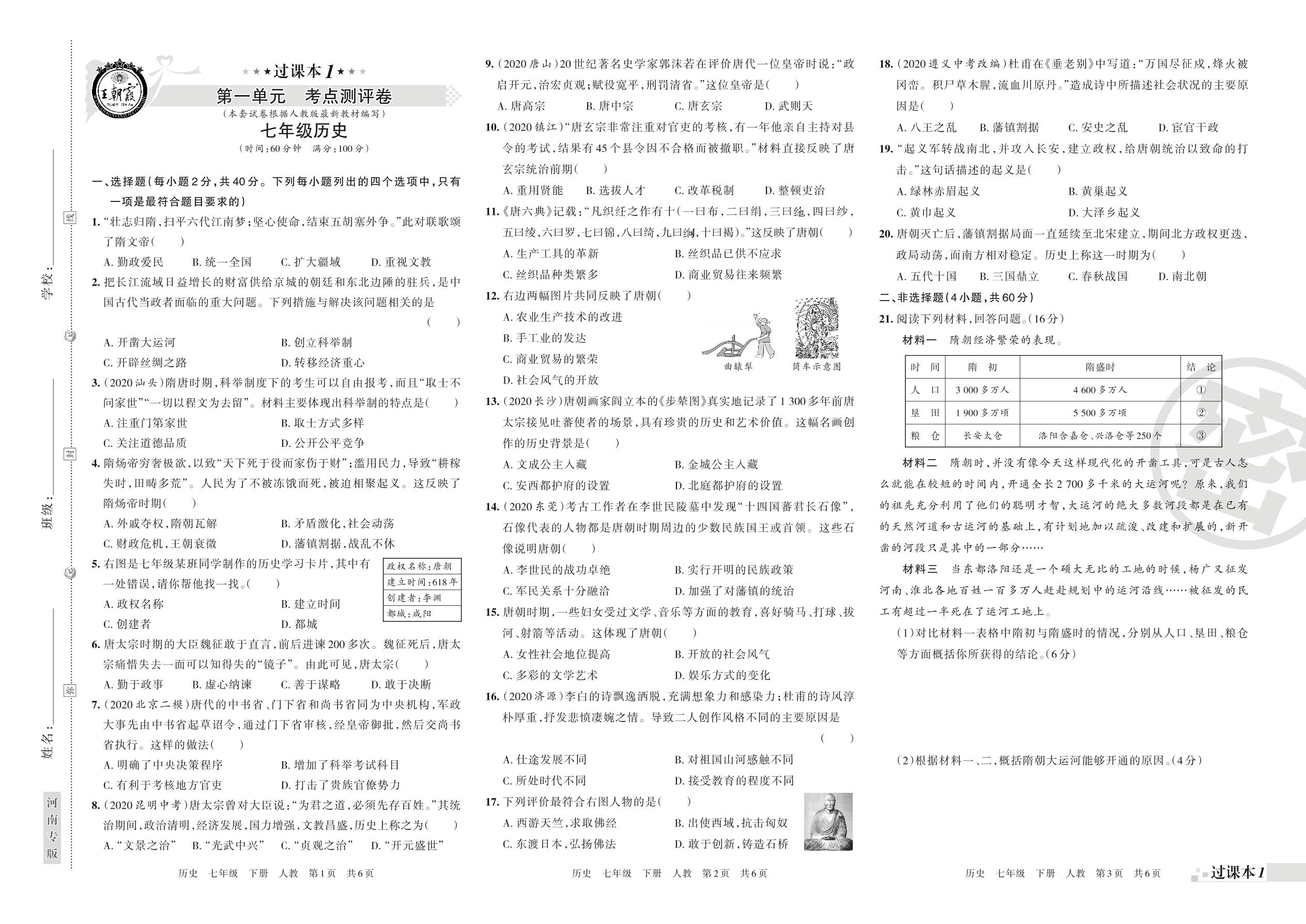 王朝霞期末过课本——第一单元 考点测评卷七年级下册历史(人教版)_R210810100209【0】