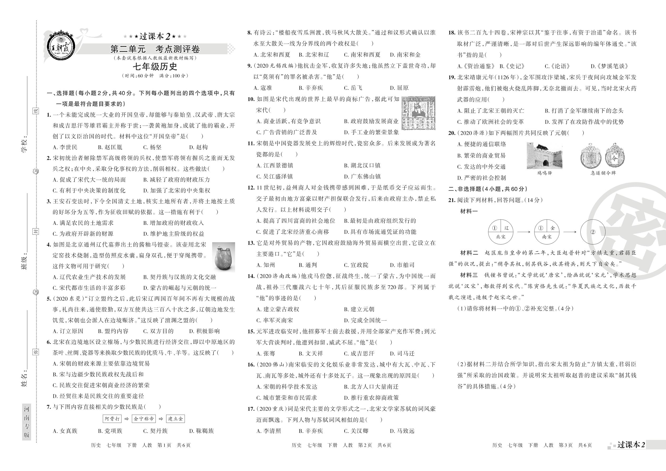 王朝霞期末过课本——第二单元 考点测评卷七年级下册历史(人教版)_R210810100218【0】