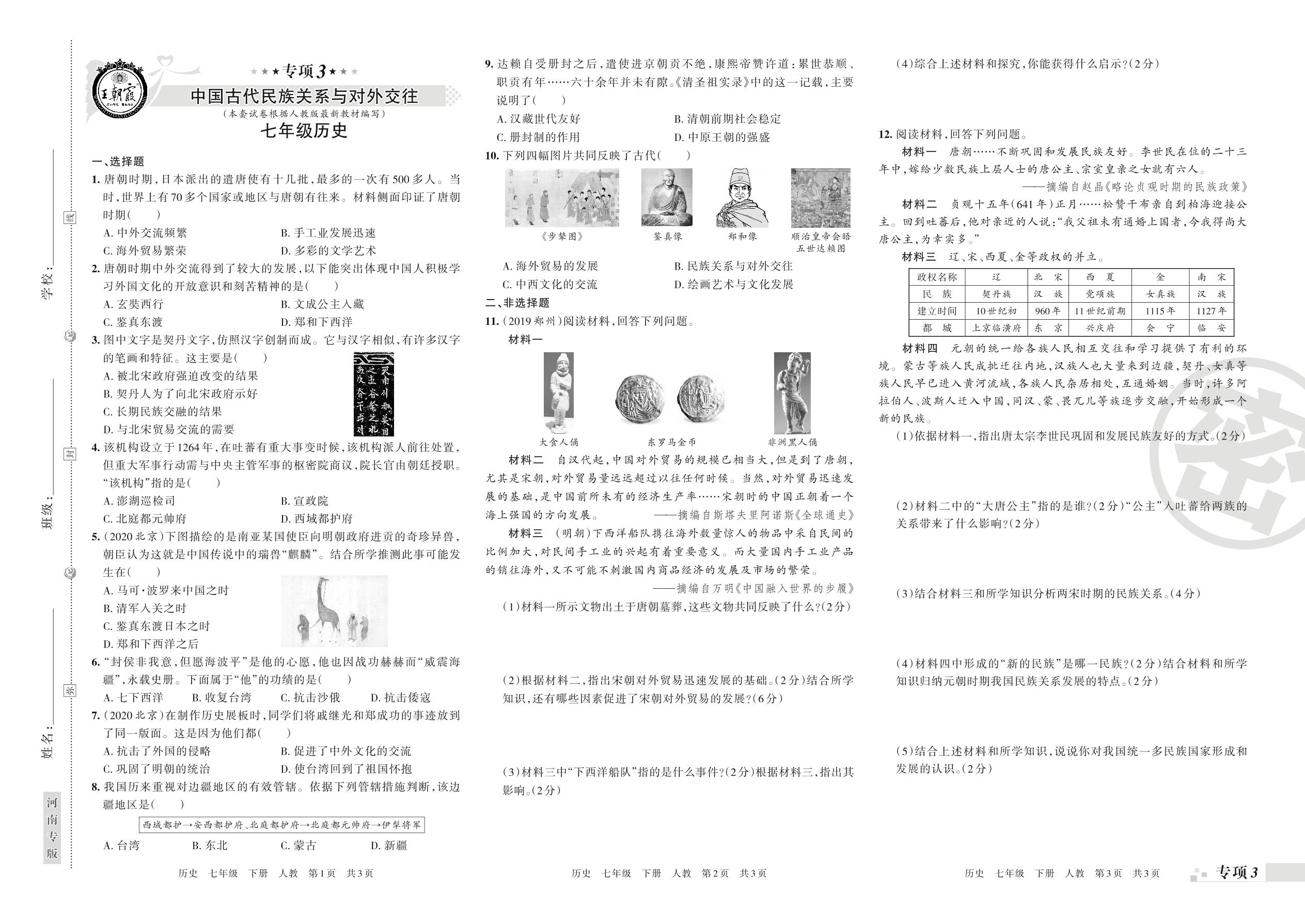 王朝霞期末专项卷——中国古代民族关系与对外交往、中国古代科技与文化七年级下册历史(人教版)【0】