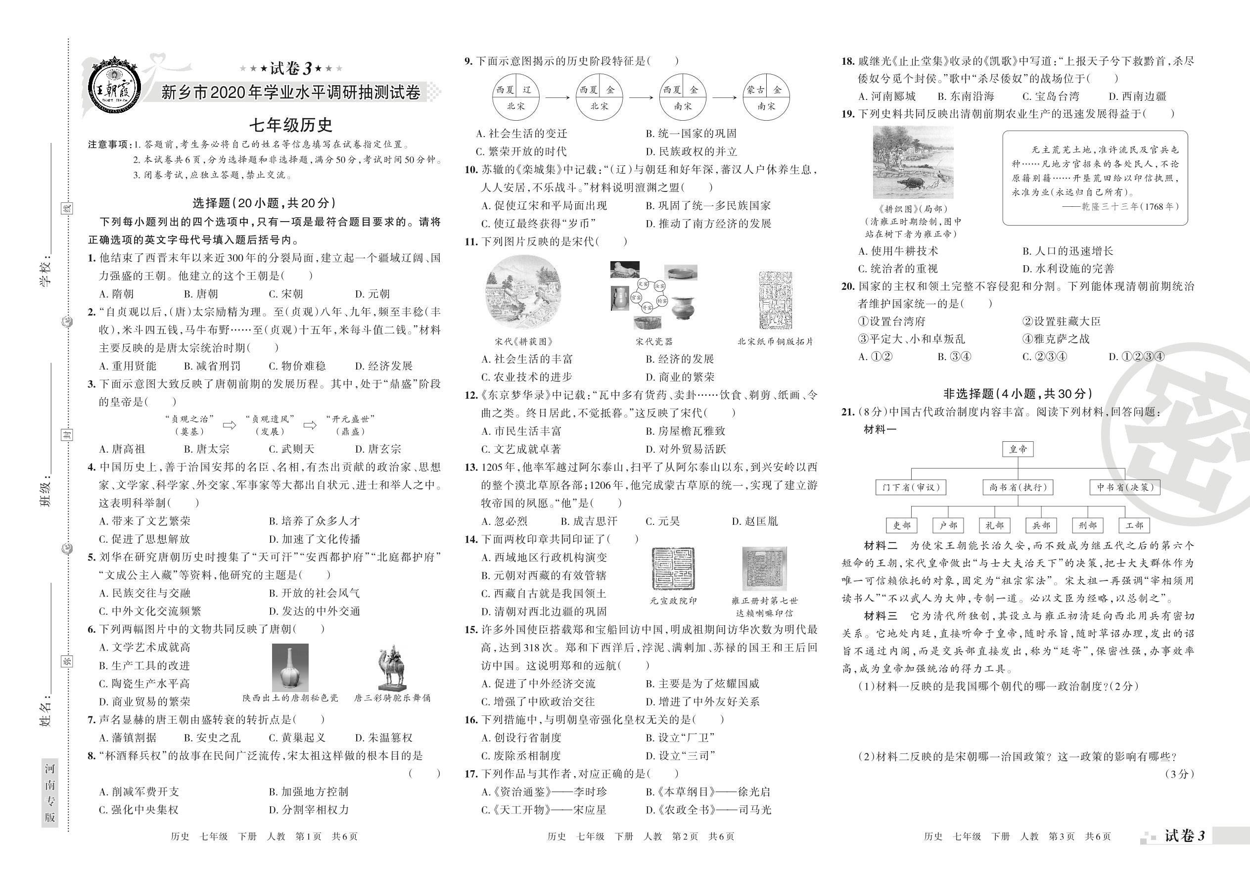 2019-2020学年第二学期新乡市七年级历史试卷(人教版)【3】