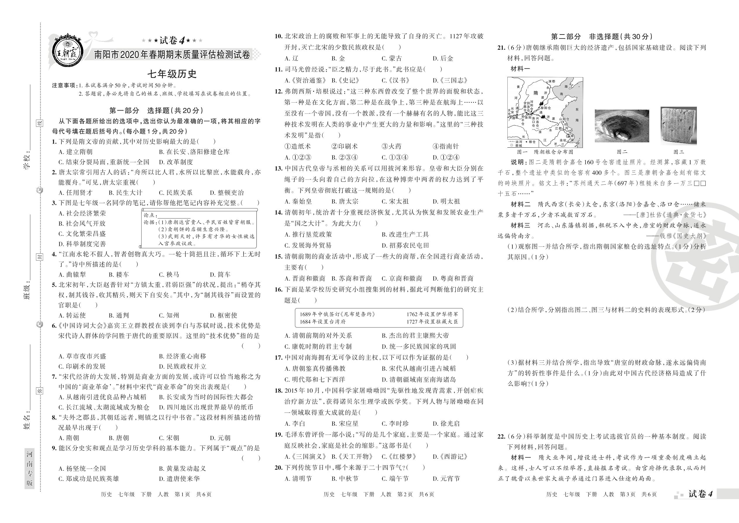 2019-2020学年第二学期南阳市七年级历史试卷(人教版)【4】