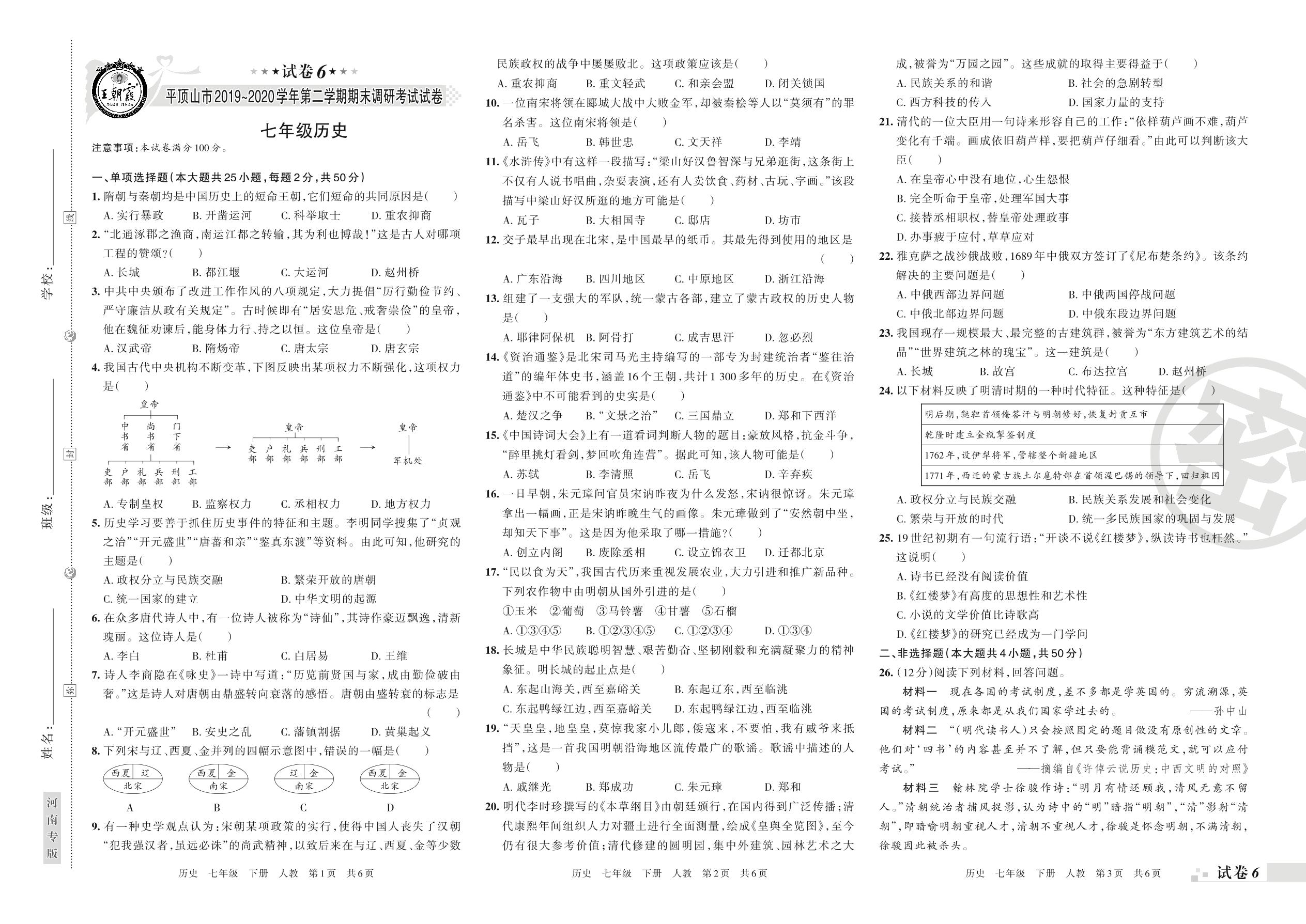 2019-2020学年第二学期平顶山市七年级历史试卷(人教版)【6】